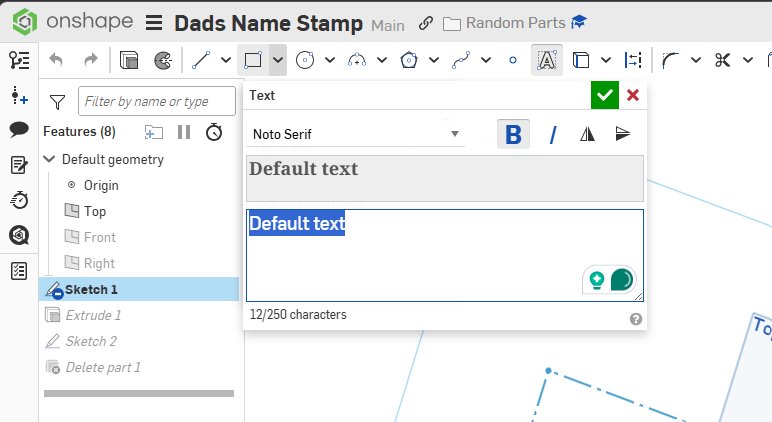 The distinction here is that the Text feature in the example doc I gave you is a custom feature. The Text sketch tool is only active when a sketch is open, is built in to the Onshape sketch environment, and unfortunately is very limited, as you have discovered. Custom features are written by users to overcome various gaps in Onshape functionality and to specialize it for particular needs (like text layout, though I would argue if this is a common enough use case to build in to the sketch tool then Onshape should make it good).