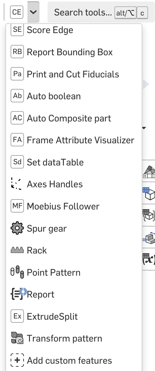 And if you want to Add the tool to your toolbar (so it's available in other documents), find this dropdown next your "Search tools…" (far right of toolbar). Click "add custom feature" at the bottom: