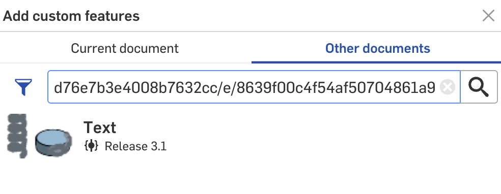 When the dialog pops up, put in the URL of the Text feature (or Surface Text, this works for all custom features) and it will show you the doc of interest. Click that doc: