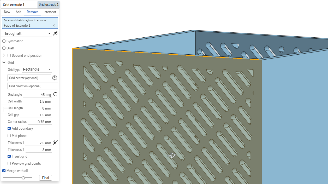 The interesting thing is the opposite wall does not exhibit the issue, even though it is the same extruded set of features. Here are the settings I am using for Grid Extrude: