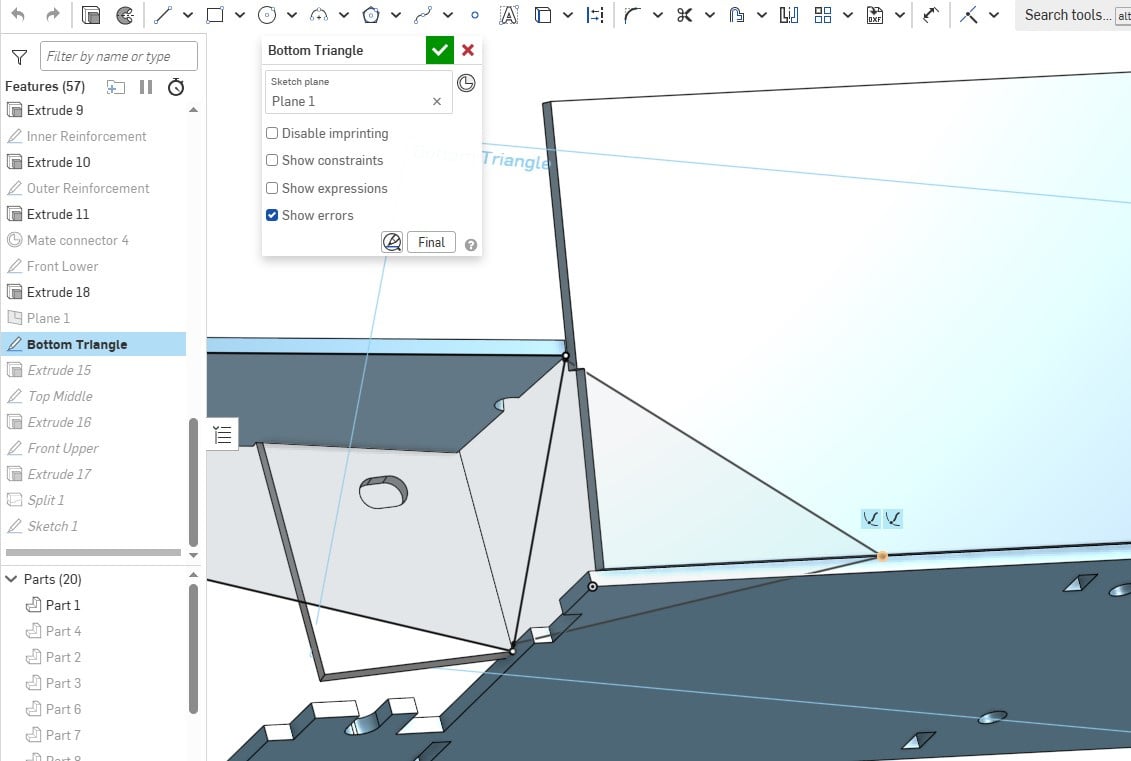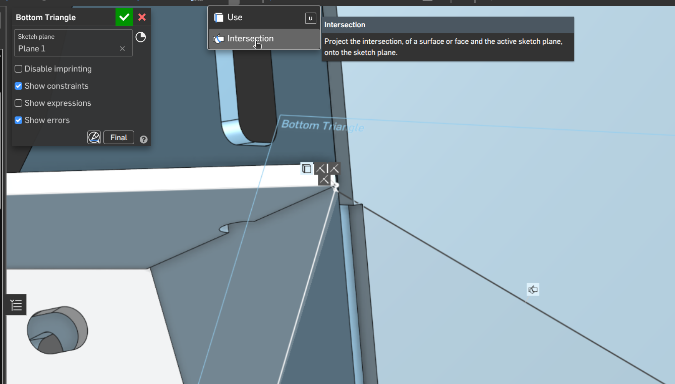 I see how you used three points on the model to create the plane for Bottom Triangle. How did you created the final point selected below? Was it done using the 'Pierce' constraint in combination with the edge of the Bottom Plate?