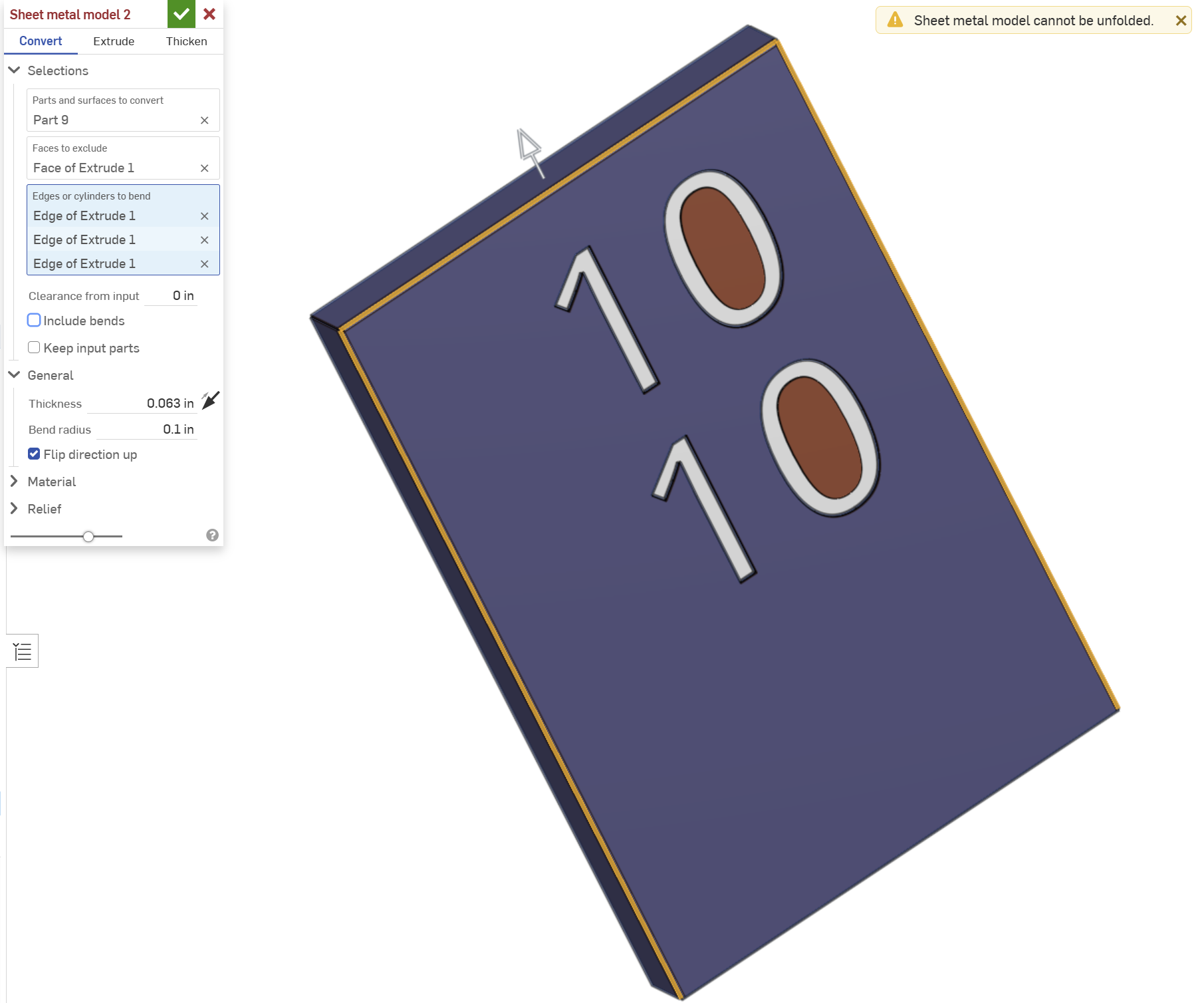 I'm drawing up some "box signs" — basically sheet metal pizza boxes with numbers cut out — and am stumbling to make sheet metal model for them. The example in the pic is a shell with 1/16" thickness and no bottom face. The letters are extruded/removed from that. When I go to make a sheet metal model I spec the sign part, exclude the back face, bend the front three edges, and set the thickness the same as the shell. The system reports that that model can't be bent. If I suppress the extrude/remove of the numbers, so just have a blank front face, the exact same sheet metal model setup works fine.