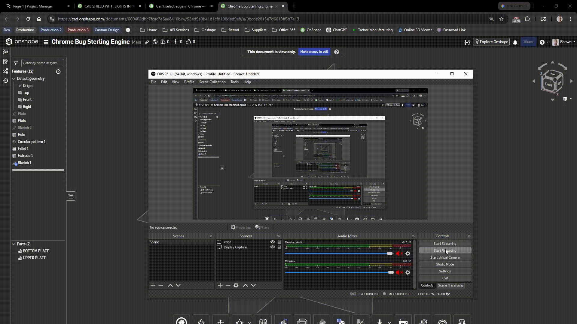 Trying out OnShape. A bit frustrated with basic functionality only to realise it's a bug. Edge selection does not work on Google Chrome. Seems ok on Firefox. Rendering is all wonky too.