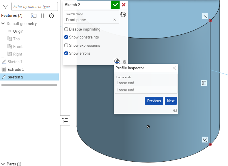 Ah, I understand what you mean now that I'm on a PC. You're looking at the profile inspector. The point of the profile inspector is to check if a sketched profile is fully closed. Sometimes things don't line up perfectly and are just off by a tiny amount. The profile inspector helps you find those spots. You are drawing a single line, so it's not a closed profile and therefore you have 2 loose ends. As long as the sketch is fully defined (with either coincident or pierce on the cylinder's edges), it's all correct.