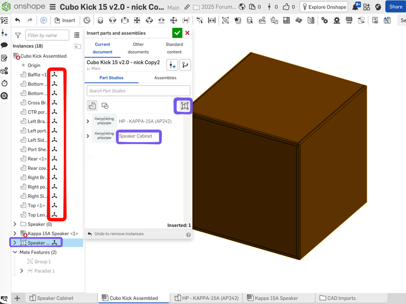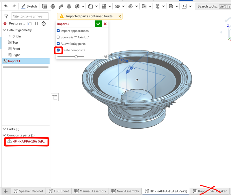 For off-the-shelf part imports, click the "create composite" option on the import. It makes the whole speaker 1 part, rather than the 16 parts it was that then require an assembly. This techicque is great for PCB's, ball bearings, power supplies, etc. You don't need the internal details of the speaker as separate parts, for example (or a ball bearing, or a pcb etc),. You just need to know its overall size and mounting provisions.