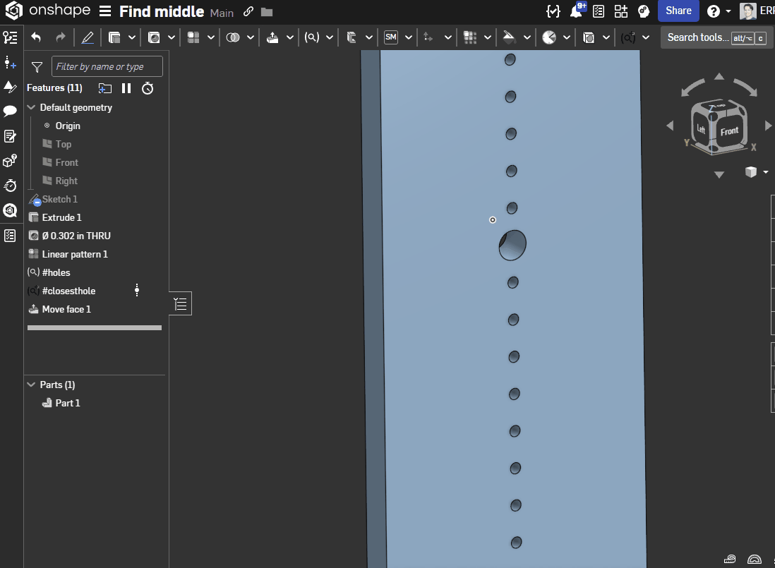 I have a hole pattern running from the bottom to the top of a panel. The pattern is spaced depending on the panel configuration and wind loads. I need to select the centermost circle of the pattern to create a fixed hole (a hole smaller than the rest)