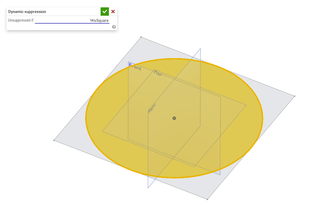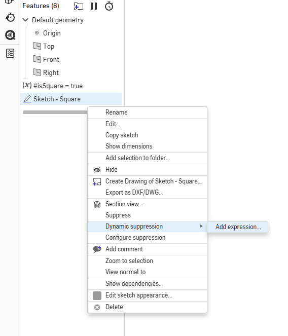 • Right click the feature and add the dynamic suppression expression to it, here is where you can insert your "isSquare" variable.