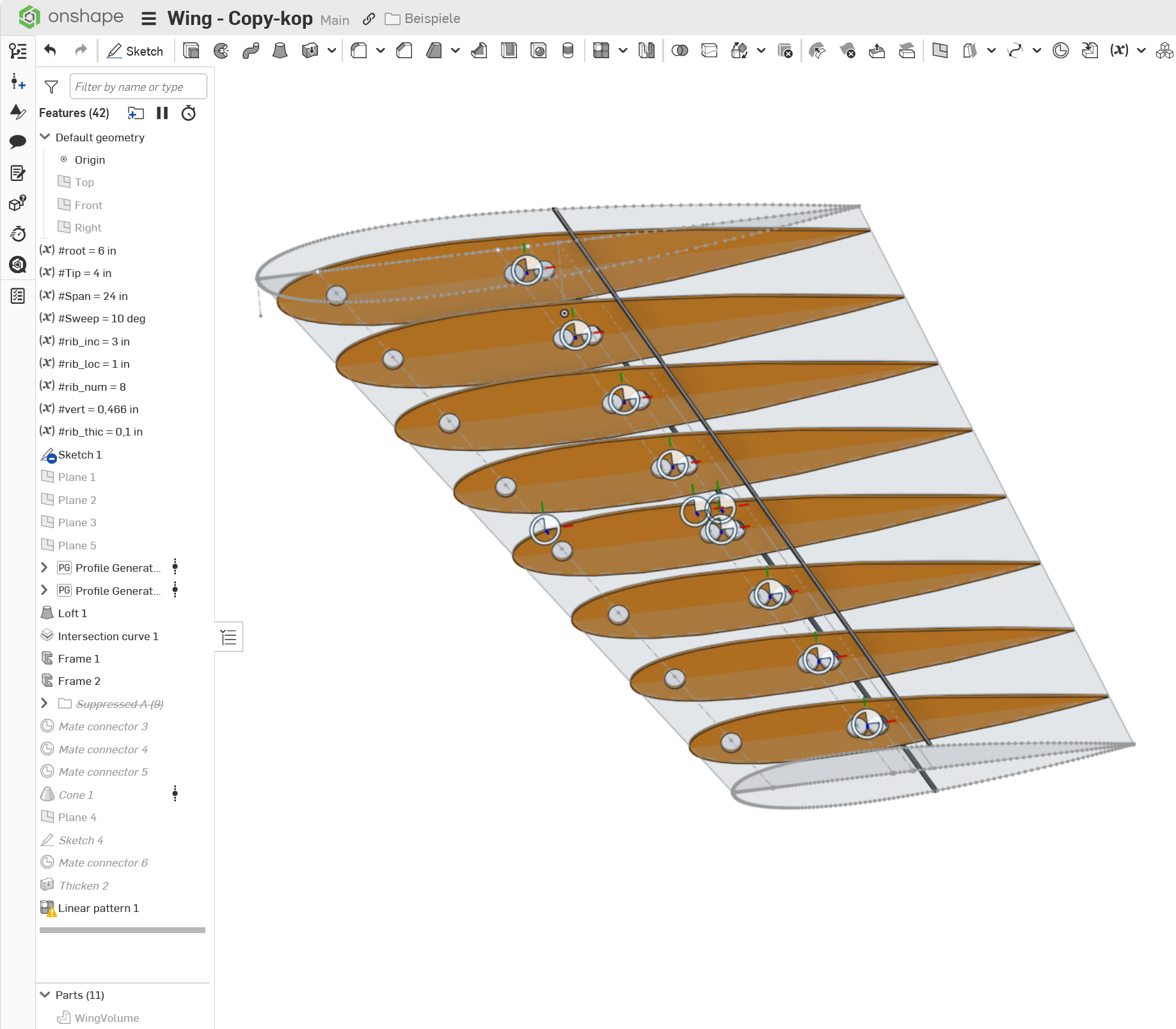 Anyway, I modified the linear pattern so as to use MCs instead of planes, used a solid for the wing volume, which already had the holes for the ribs by means of a boolean. It worked then: It is fewer steps, too.