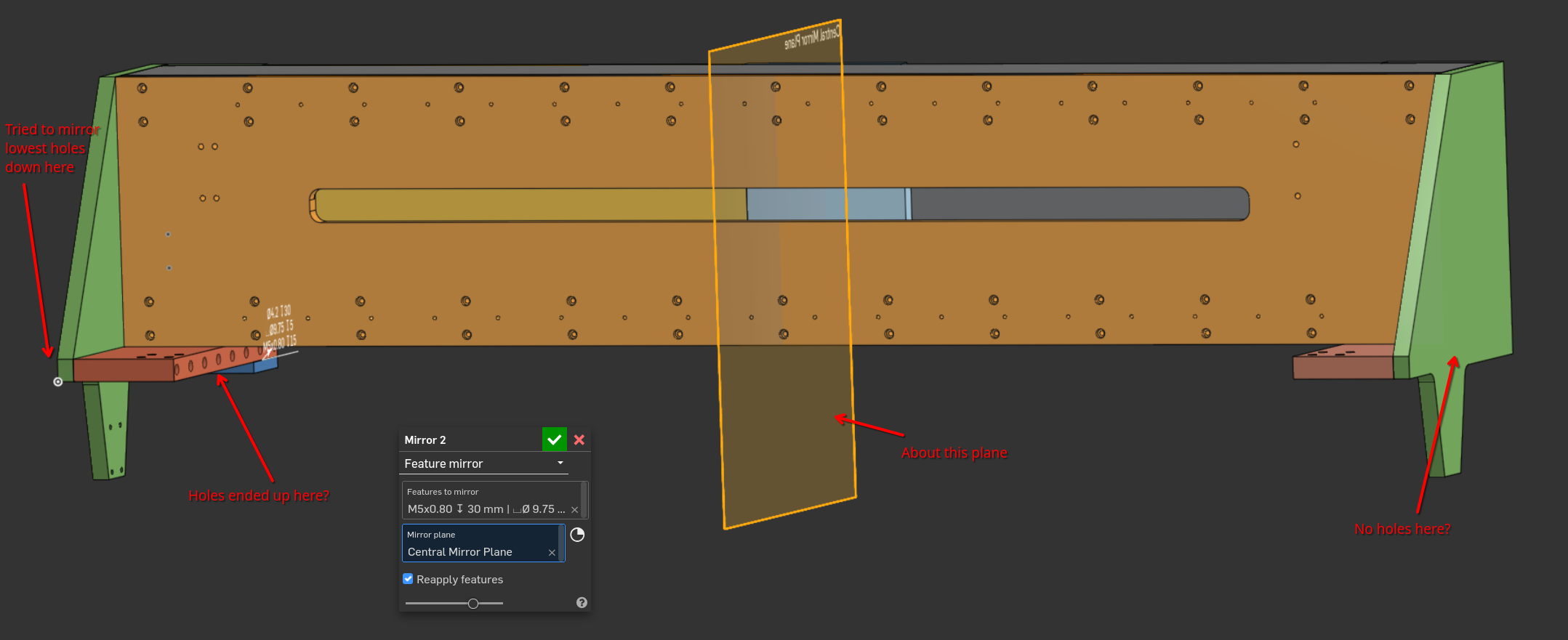 However, I've hit a second problem. When I mirror about the central plane I have drawn the holes appear in the wrong place. They appear in the red part on the left hand side rather than the right hand green part. I've tried selecting a number of different planes as the mirror plane and the holes always appear there.