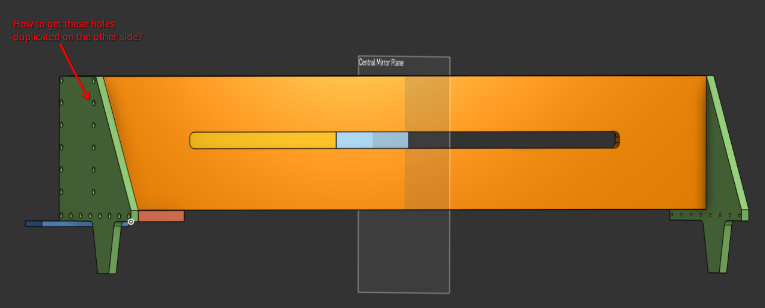 On the left side plate I've added a number of counterbore holes. The threads are in the edge of the orange front plate. When I mirror the left side plate the holes in the side plate mirror but no holes appear on the right hand side of the orange front plate.