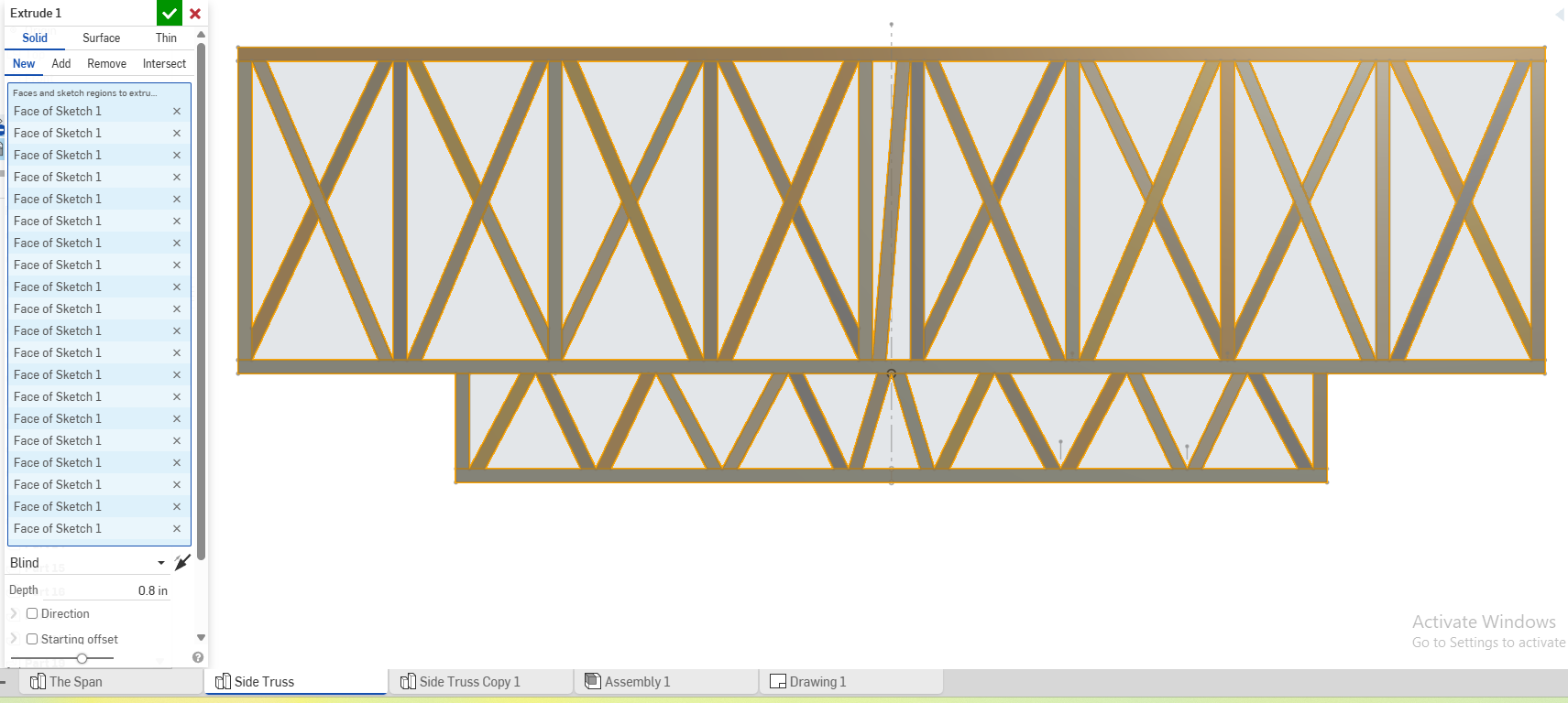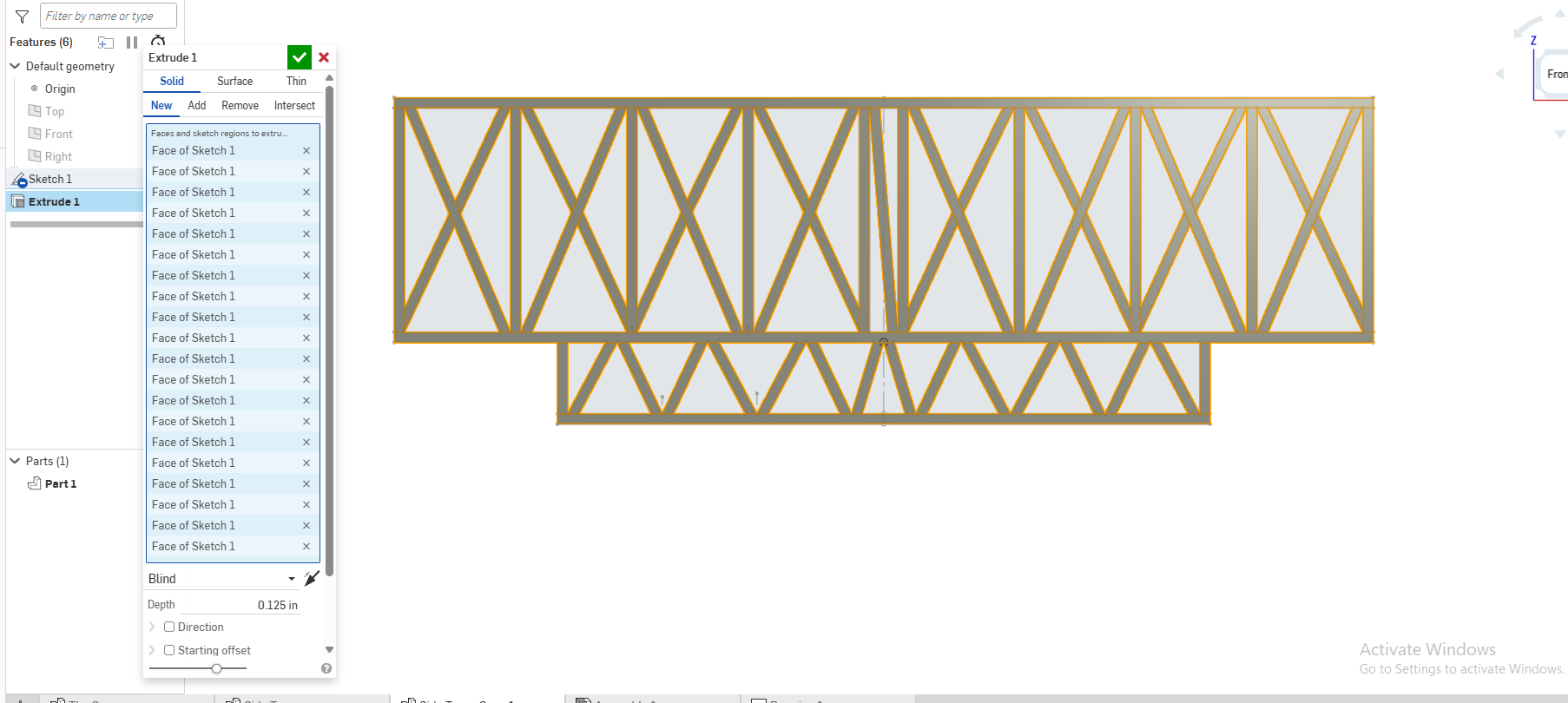 Extrude the outer frame first, then add trusses and braces using linear feature patterns.