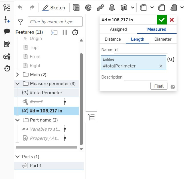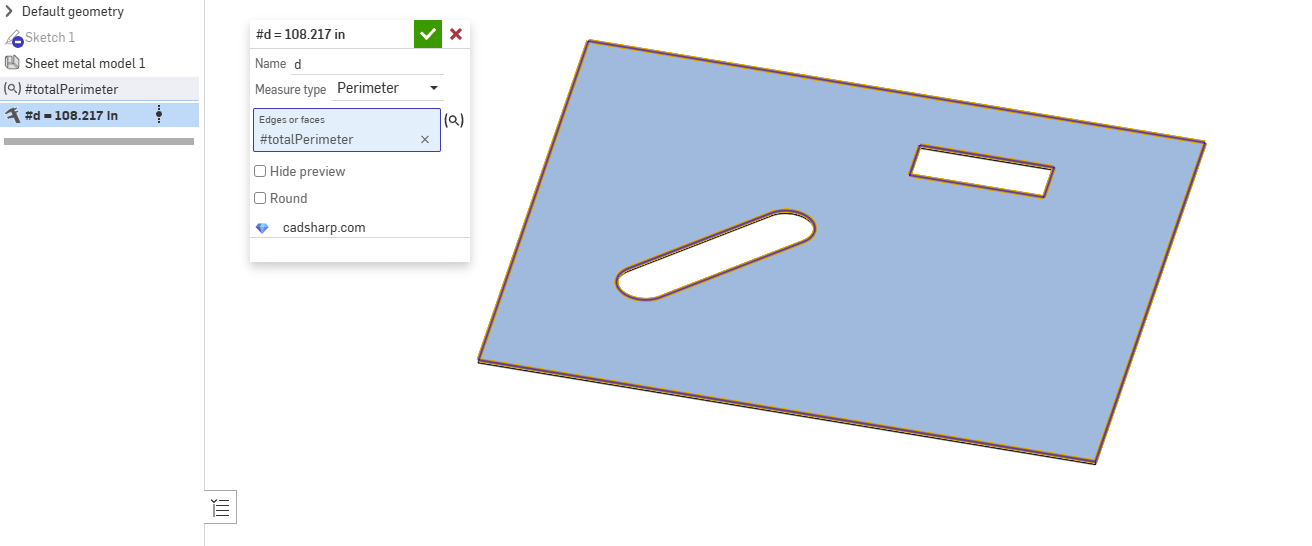 I need to see the total length of the sections to be laser cut on a piece of sheet metal. I had to select each element individually to create the length shown in the image, which took a very long time. Is there a shortcut to this process?