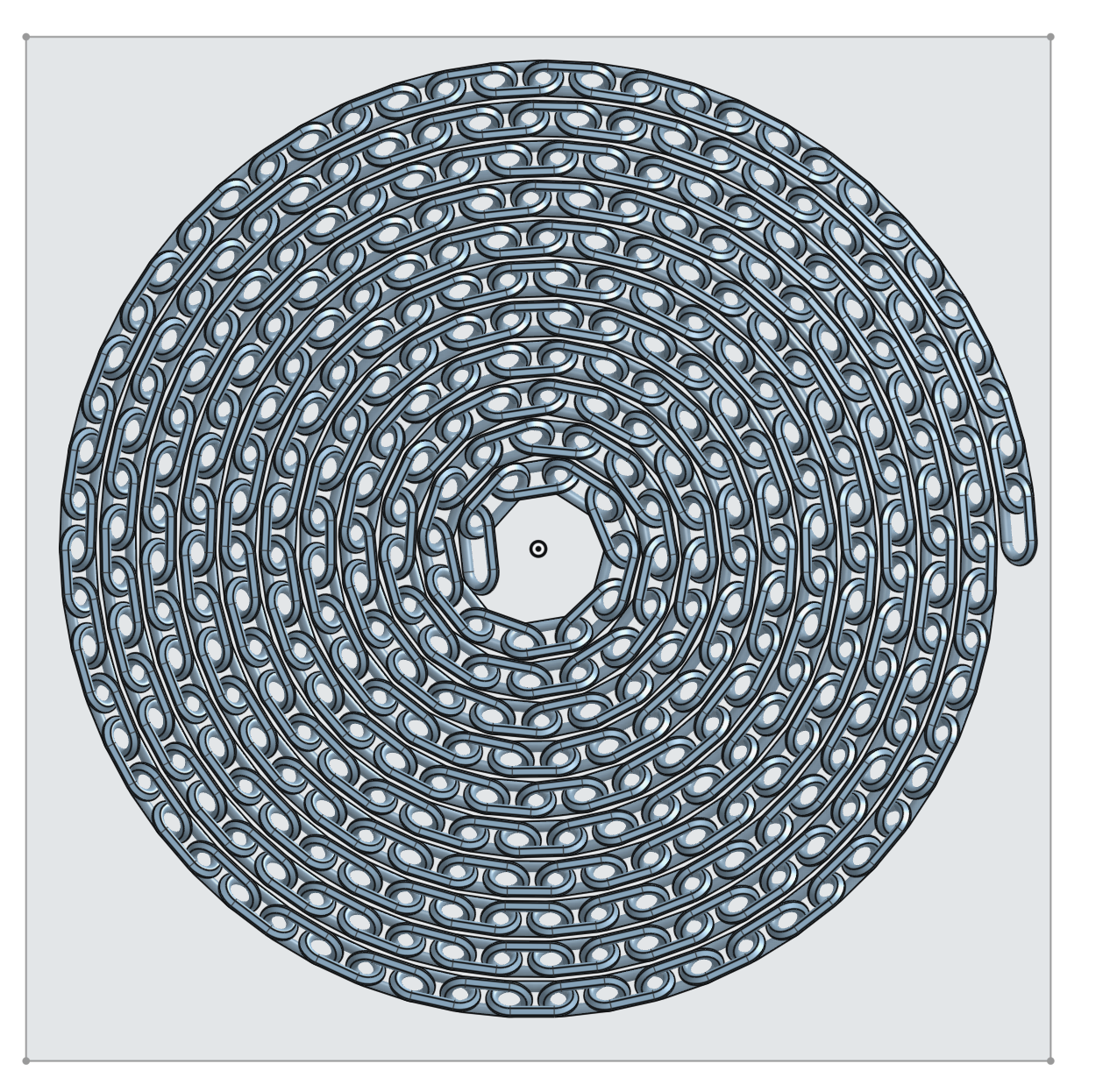 If you're trying to maximize the number of links in one layer on the print bed, then doing a pattern that goes back and forth in rows would be better than a spiral. I have no idea what the mathematically optimal packing would be, but spiral is not it.