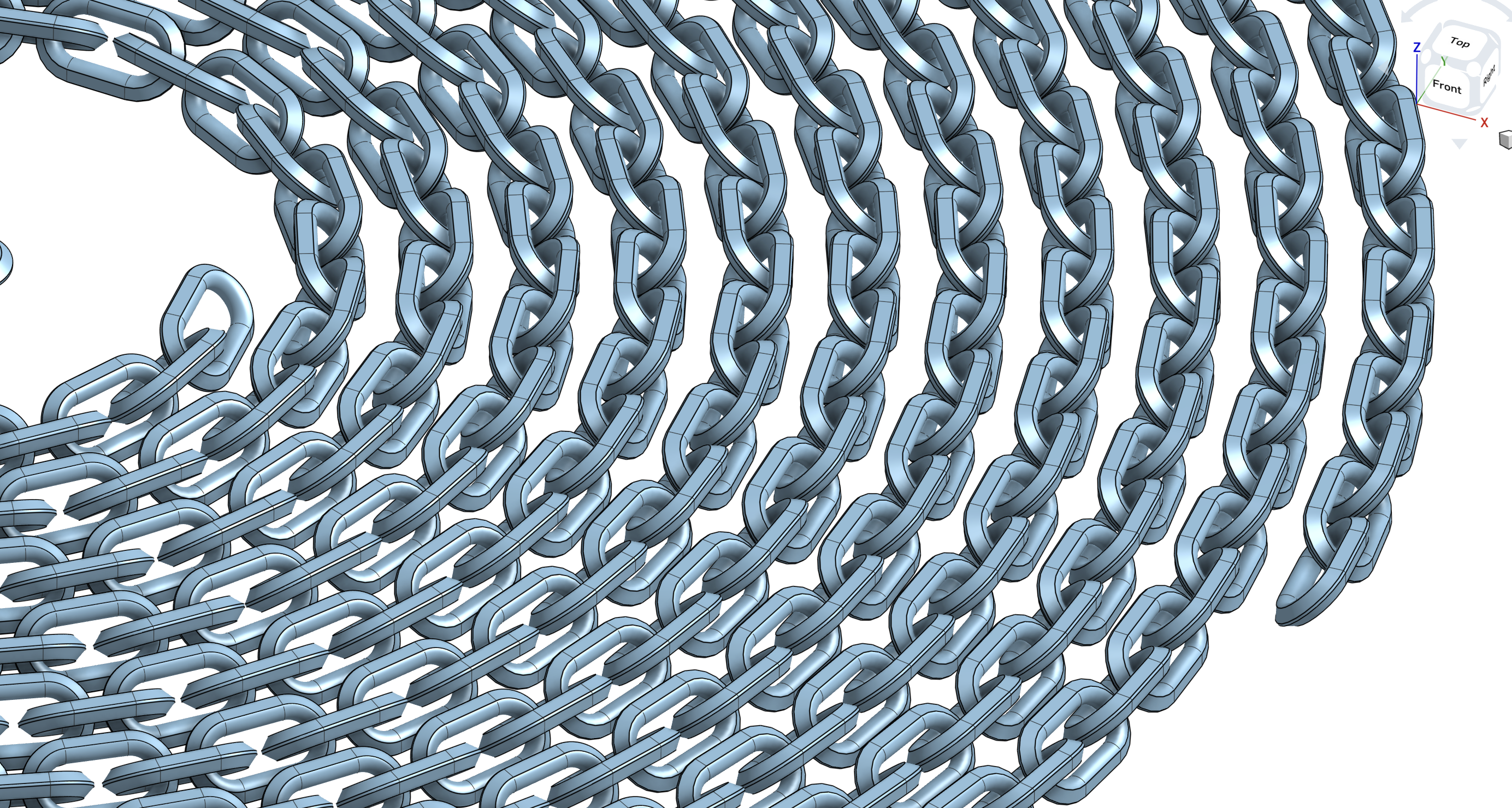I would like to print a chain in spiral on my 3D printer. I have been able to make th chain link but when i try to make a pilote repetition for more link, as the spiral gets bigger, the chain links start touching each other and that will be a problem whe printing and getting the chain off the printhing bed. Whould there be a solution so that the spacing and the angle between each link follow the spiral eaven if the spiral get's bigger or smaller or if i change the number of links in the chain. I hope that my explanation of the situation are good. Here the link to the onshape file. There was an error displaying this embed.