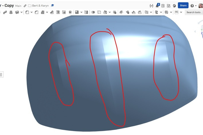 Could anyone possibly give me some guidance on how to match the tangency, or possibly the curvatures between my lofts in this model? See image below for problem areas. It is where my loft edges meet. I can get the start profile conditions set with match tangency, which smooths the bottom edge of the lofts pretty well, but none of the end profile conditions work.