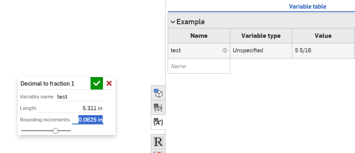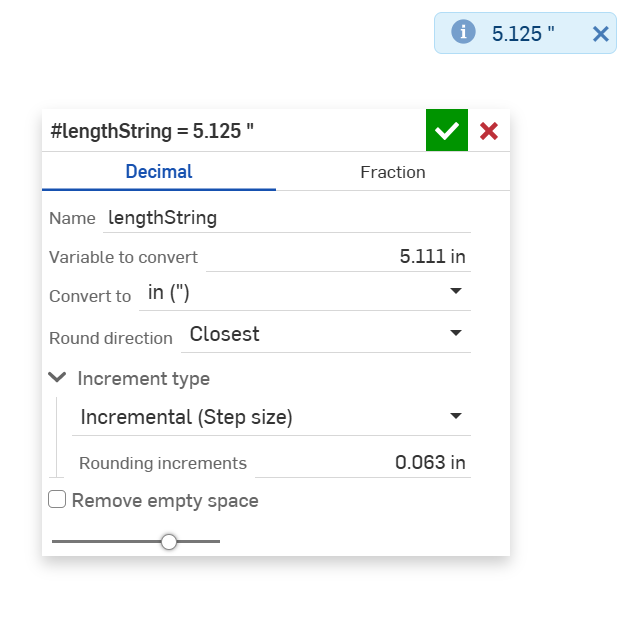 convertToFractionfrom your own code. You can specify the output format by "precision" or 1/16, 1/32, and 1/64 increments. It finds the closest match. An output of "precision 1" returns a fractional representation that fits in X/Y. A "precision 2" returns XX/YY, etc.A concrete example: