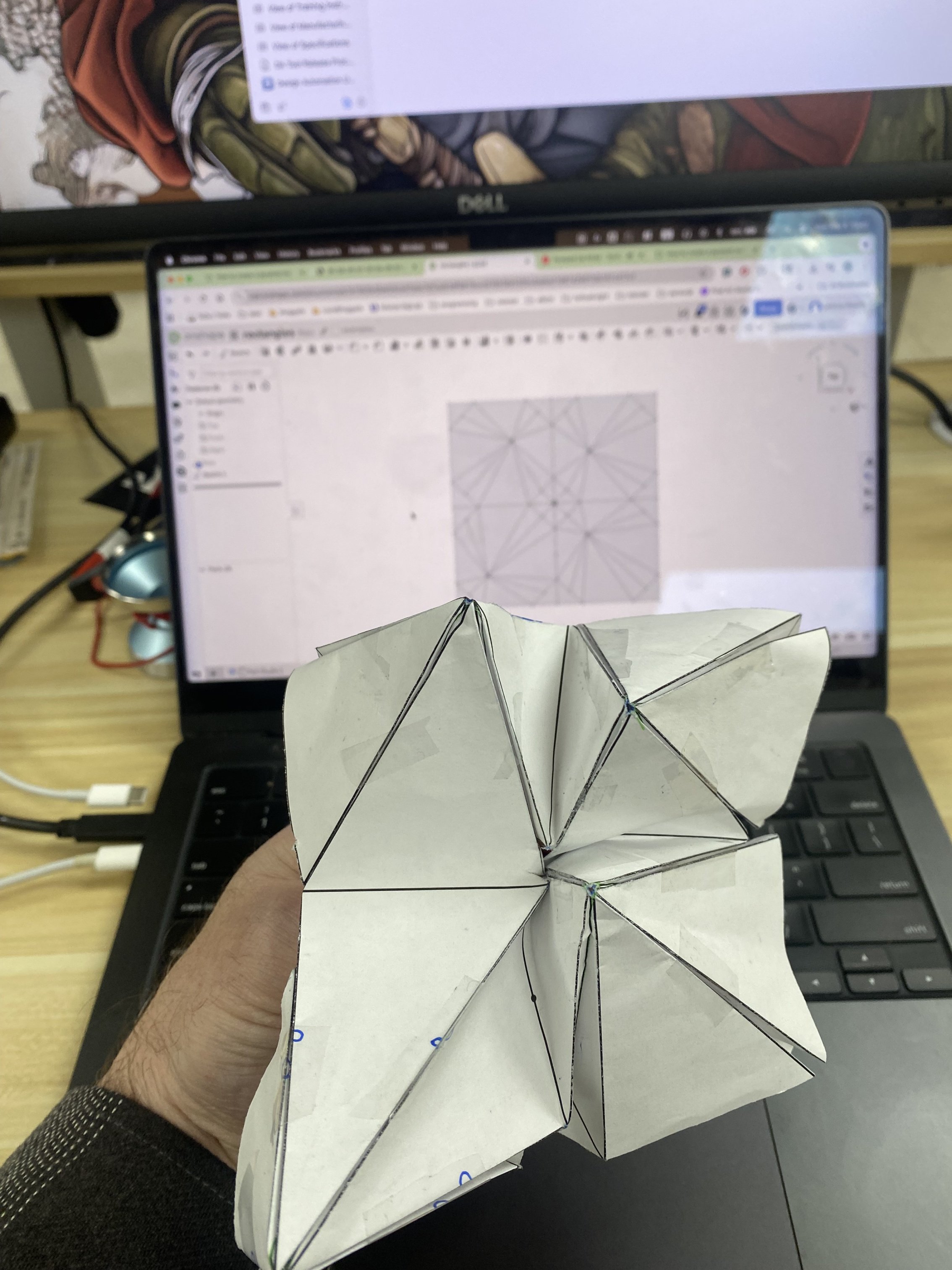 And yes I know my folding is an abomination, apologies. But the tip locations make sense w.r.t to the flat pattern on screen (upper right → an upper right pointing pyramid, like my top-left pyramid in the quad).