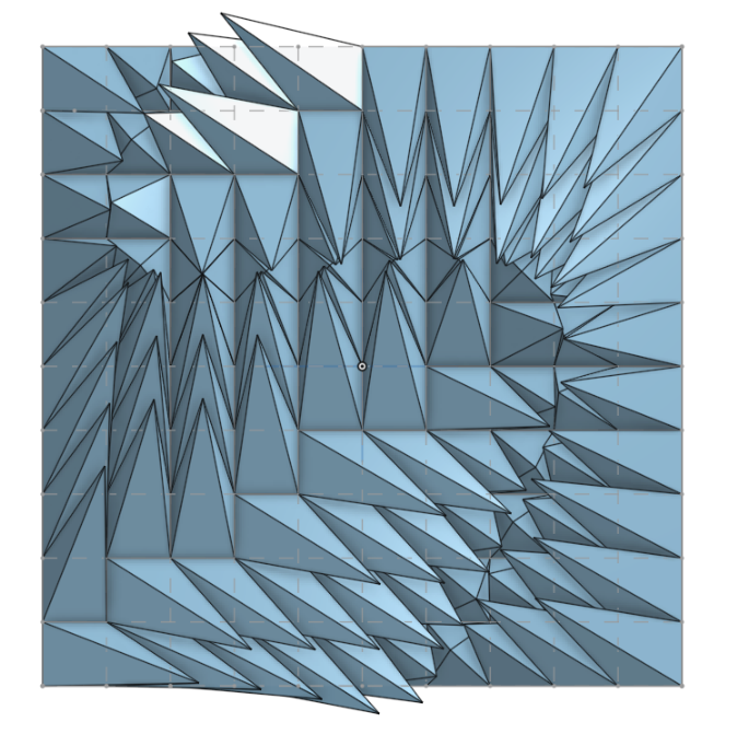 The problem here is some pyramid tip points are outside of the projected area of the base square. That will lead to self-intersections in the flat pattern and prevent the use of the shee metal toolset. There will be single pyramids or maybe small groups of pyramids at places.
