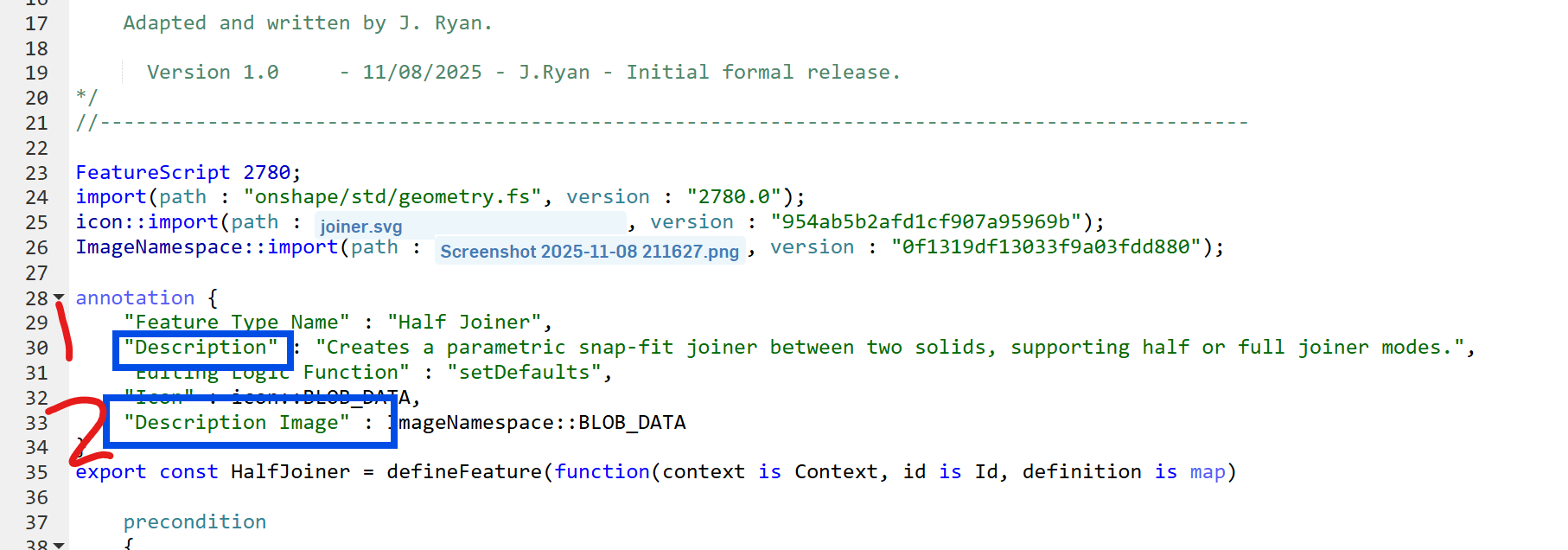@jason_ryan337 looks like you found the solution already but for anyone coming after looking to publish and running into this issue, the "Description" field on the feature definition needs to be labelled "Feature Type Description" instead. It's a subtle thing I ran into when I was first publishing some of my scripts that isn't obvious from the notification alone because none of the standard library scripts have this field filled out for their feature definitions. It is documented in the UIspec page for featurescript though.