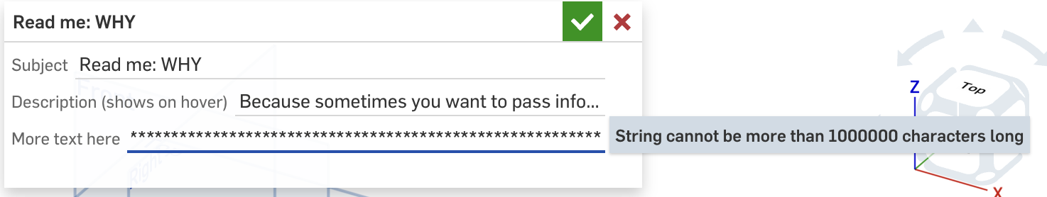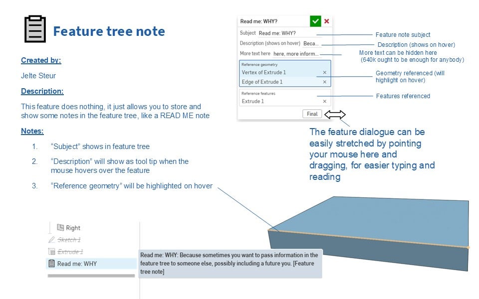 I love it! I made a "note" feature a while back I never released, but yours is better. Have you seen the Design Intent feature? Very similar, but lets you choose which features you're talking about, which is a nice touch. It'd be a breeze to add that to yours if it helped.