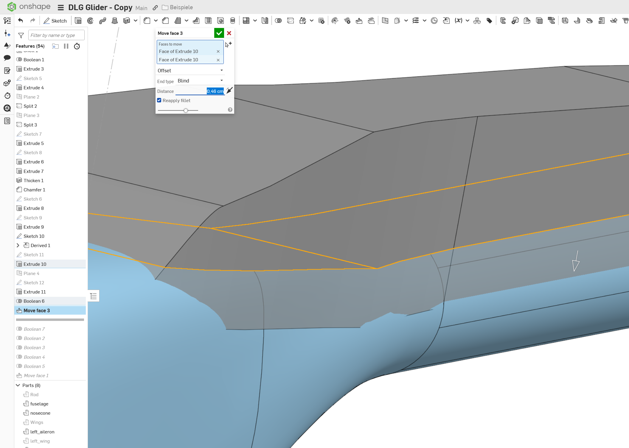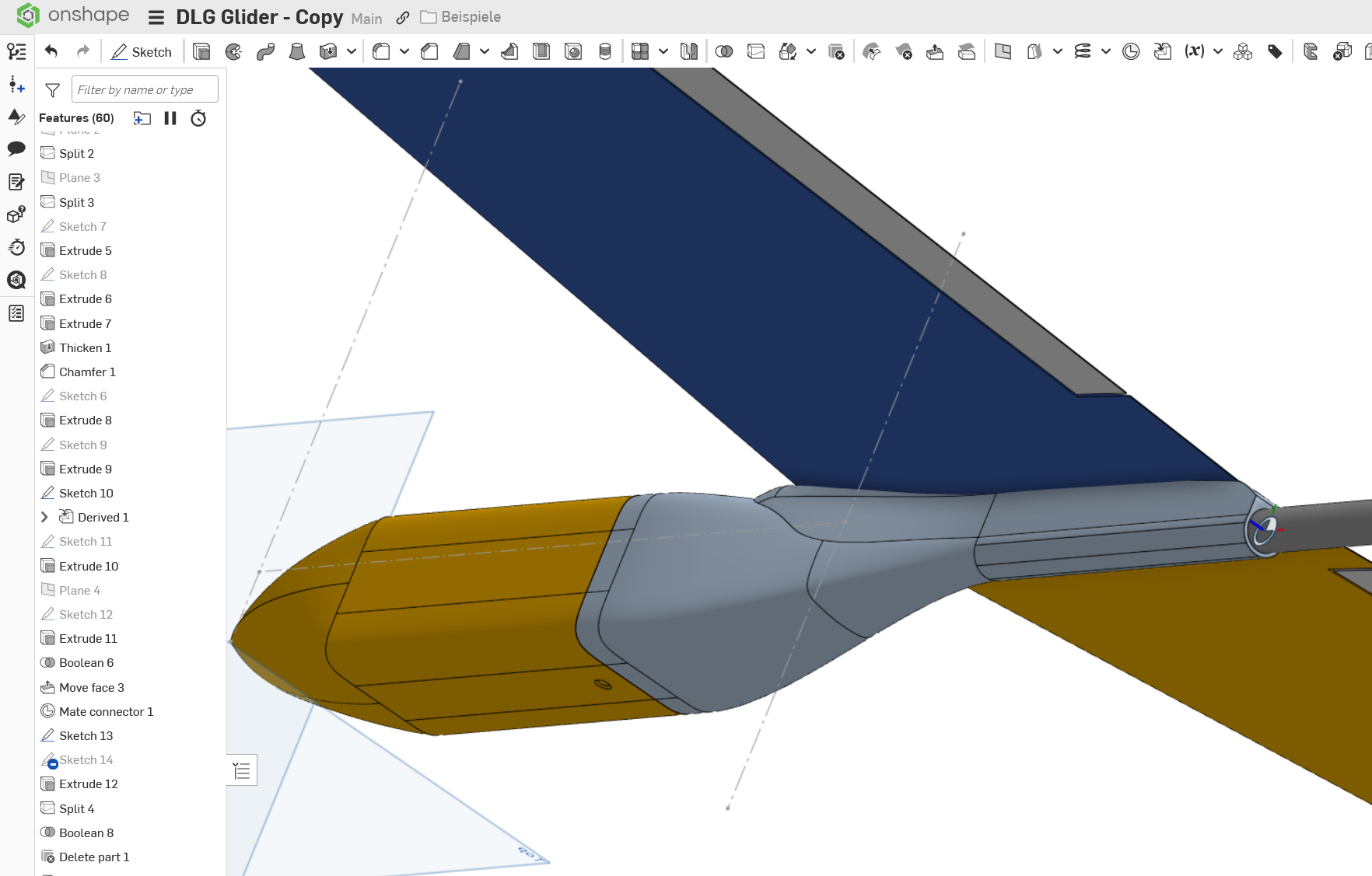 It always gives me the creeps when I see people hiding origin and XYZ planes first thing when starting a design. Build the fuselage center on the origin. Use the standard plane that is titled "Right" as a symmetry plane, then only build one half of the glider. Saves you half the work and makes sure the other side works just as well.