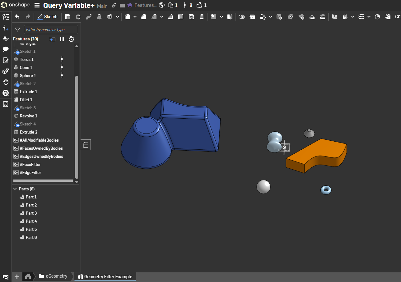 Query Variable comes with the ability to select matching edges or matching faces, why not matching bodies? Well the qMatching feature doesn't allow this selection type so that's why it's not allowed here, but there's a similar function called clusterBodies that does something close to this for cut list purposes. I leveraged this into a qMatchingBodies function that allows you to select a part and the function will return all parts in the studio that clusterBodies identifies as a geometric match for the input. (With some tolerance)