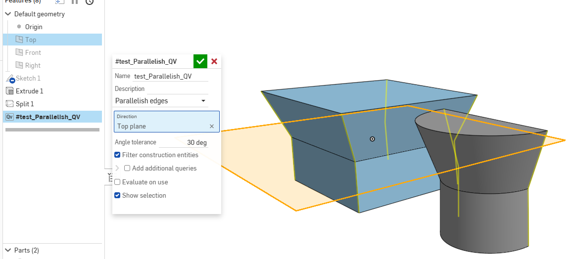 On the topic of parallelish edges, I'm running into challenges where I'd like to choose ALL parallel edges in a part studio, not just limited to ones on the selected entity. I'd later use that to intersect some other criteria to get the selection count under control. I also keep wanting to be able to choose a direction in addition to any line. I very frequently want all "up" edges, and would rather pick the top plane than a random edge somewhere.