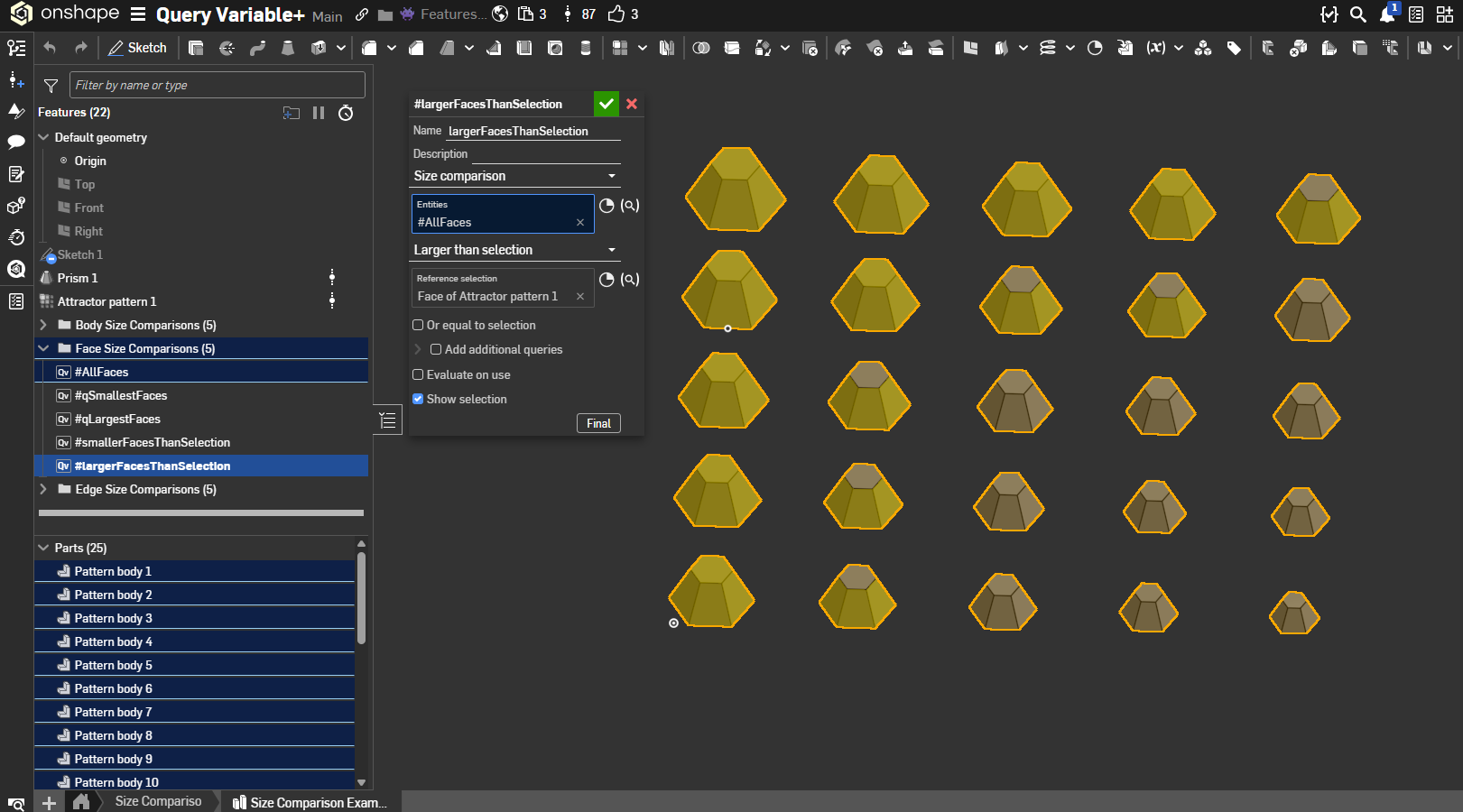 Query Variable comes with the ability to select matching edges or matching faces, why not matching bodies? Well the qMatching feature doesn't allow this selection type so that's why it's not allowed here, but there's a similar function called clusterBodies that does something close to this for cut list purposes. I leveraged this into a qMatchingBodies function that allows you to select a part and the function will return all parts in the studio that clusterBodies identifies as a geometric match for the input. (With some tolerance)