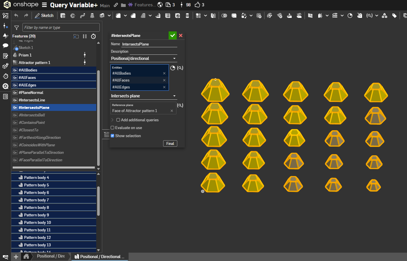 positionalPlane) and filters the input entities (positionalEntities) to those with normals parallel to that plane viaqParallelPlanes; returns a Query of the matching entities.positionalLine) to keep entities intersecting that line throughqIntersectsLine; outputs a Query of the intersecting entities.qIntersectsPlaneto find entities crossing that plane; returns a Query of intersecting entities.qWithinRadius; emits a Query of entities inside or touching the ball.qContainsPointto find entities that include the point; outputs a Query of containing entities.qClosestToto pick the nearest entities to that point; returns a Query of the closest hits.qFarthestAlongto keep entities farthest in that direction; results in a Query of those entities.qCoincidesWithPlane; output is a Query of coincident entities.qPlanesParallelToDirectionto keep planar entities whose normals align with that direction; produces a Query.qFacesParallelToDirectionto retain faces parallel to the given direction, returning a Query of those facesDerek Van Allen | Engineering Consultant | Meddler@Derek_Van_Allen_BD there is also qInFrontOfPlane, and using intersection query of 2 such queries for plane-offset/2 and -plane +offset/2 there can be made a query for entities within +-offset/2 from plane - a tolerant version of qIntersectPlane