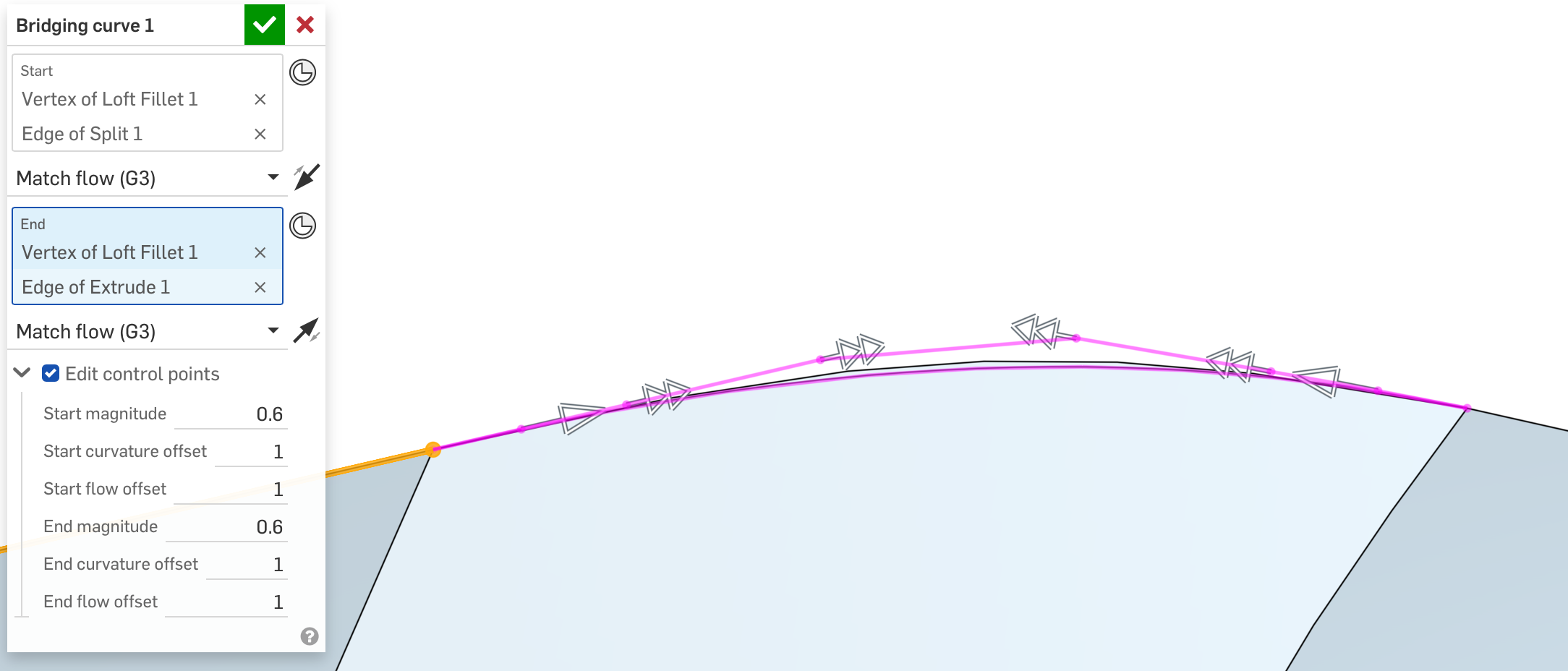 I wouldn't include all the Bridging curve parameters, but I would include the Start and End magnitudes, with edit control points on. Here for example, I would like to see 0.6 as the magnitude that is exposed to the user in your feature, but under the hood these would be the settings:
