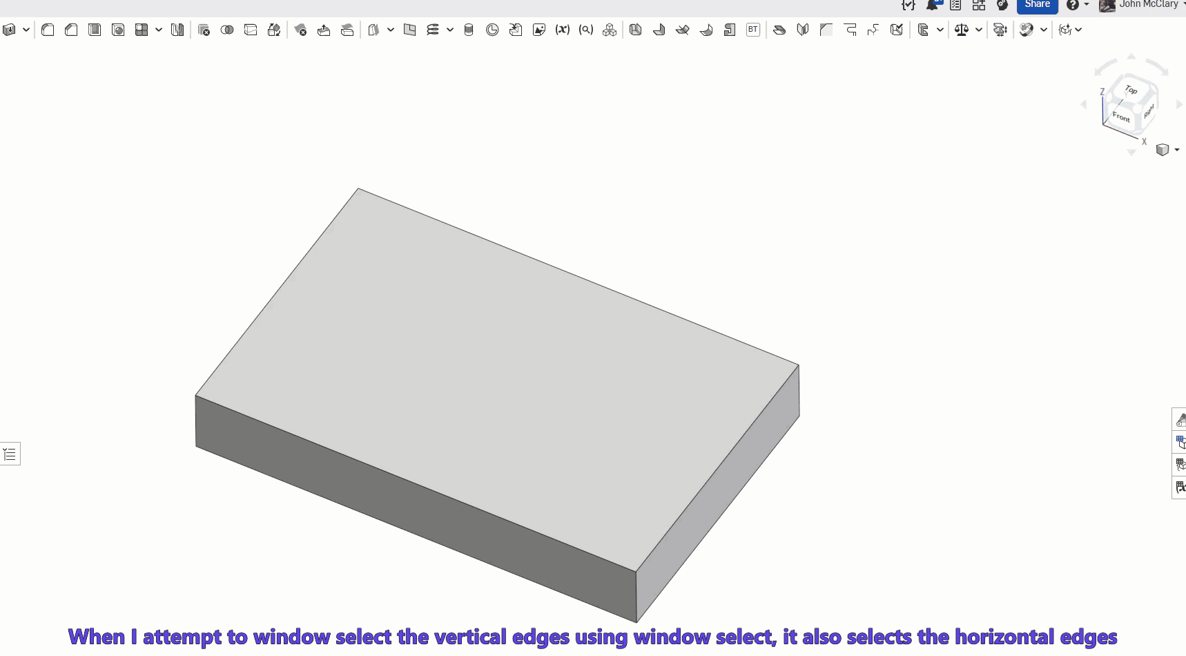 The first half of the gif is with 0.6px the long edges are being selected even with the blue window select. Changing the line size back to default in the second half of the gif restores the expected behavior for a blue window select.
