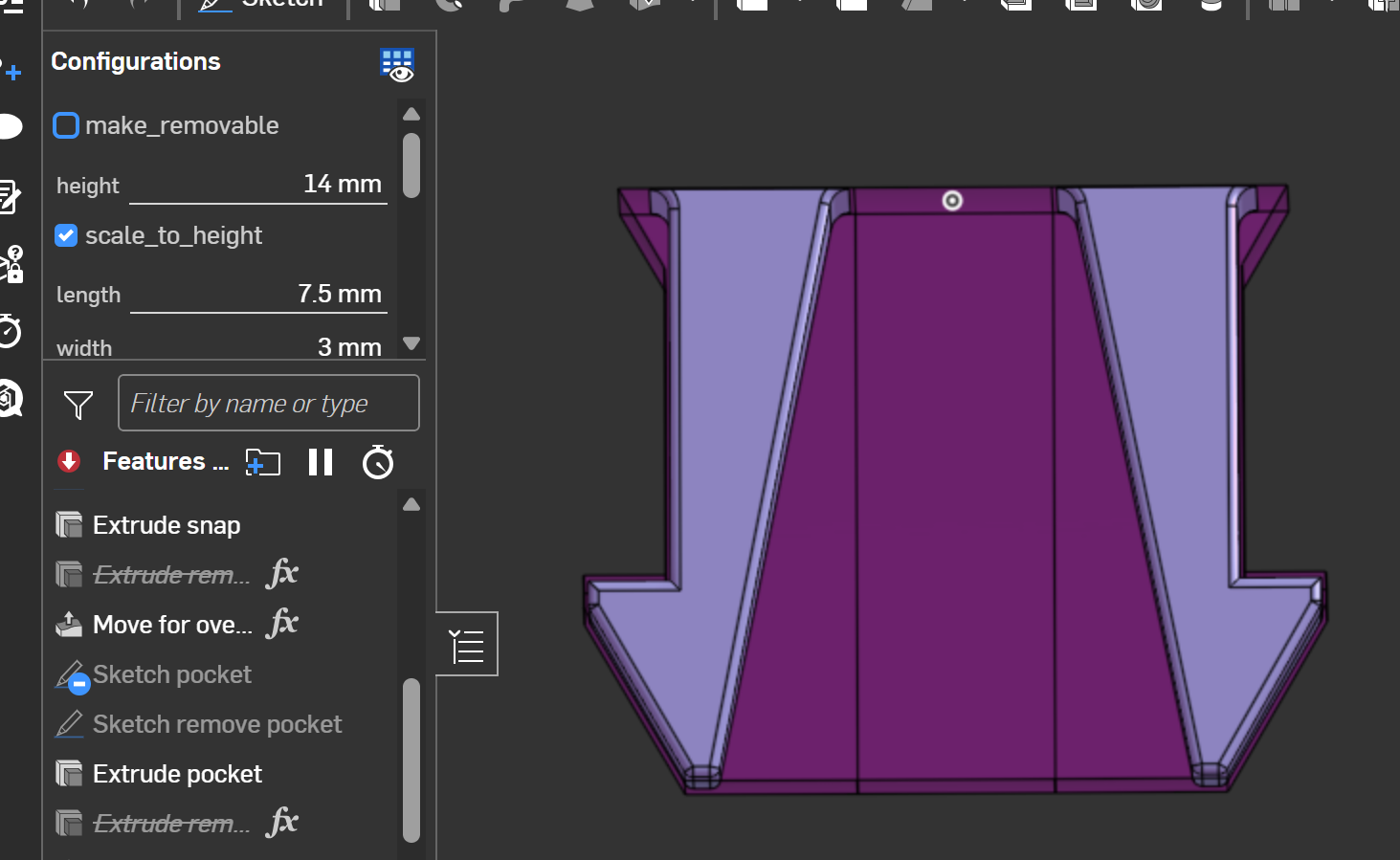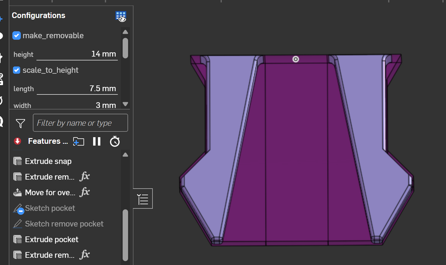This is a perfect example of where this feature shines. I know there are snap hook custom features people have made for Onshape but if their geometry isn't exactly right for your application you'd have to dig into their code and wrap your brain around it before modifying it - and that's assuming they programmed it any kind of reasonable. The other beauty is that any improvements to Onshape as a whole make this tool better by extension so if the developers ever add more functionality to configuration parameters like they did recently with conditional visibility, I don't need to update anything with Amalgamate in order for people to make use of the new functionality.