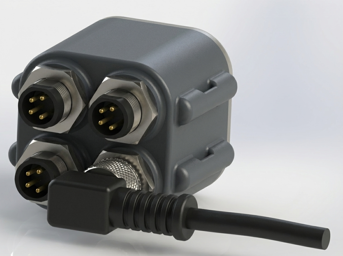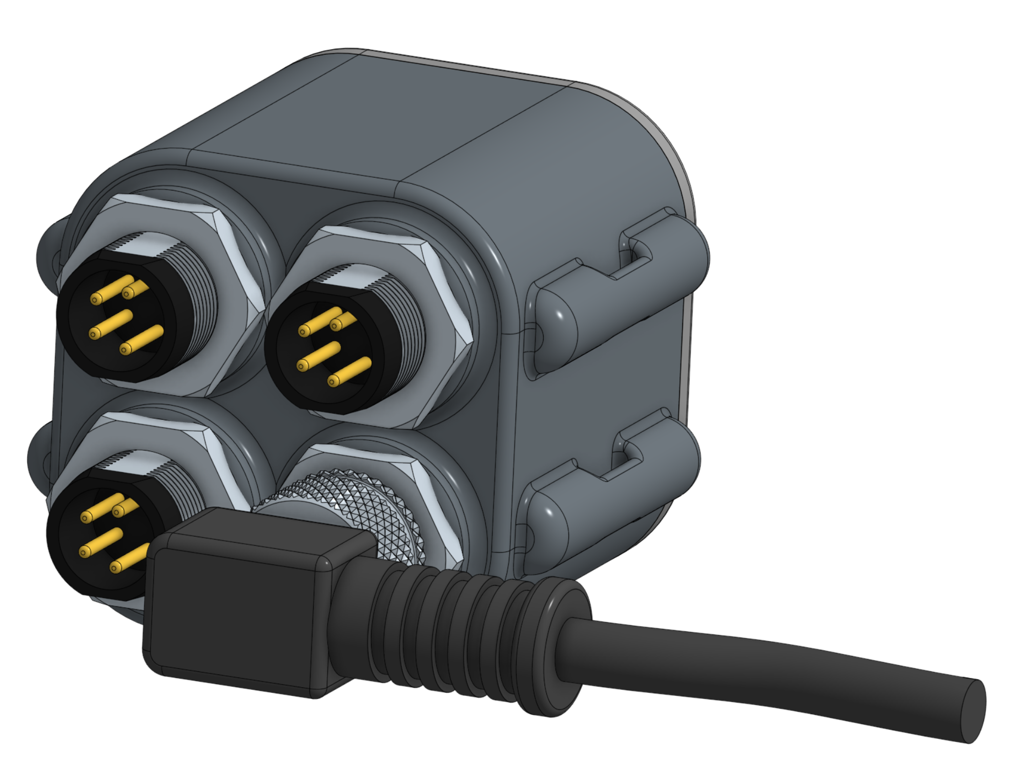 So, let's try something else and max out those 500 characters: "Dark grey plastic for the housing and rear lid. The washers under the nuts are intergral parts of the plastic housing. A black cable-tie is inserted in the slots at the side of the housing and closed around it. Nickel plated metal parts, brass pins, rubber connector housing. Black PVC cable with horizontal print "ISO 9001 certified" in light grey. 4 wires are visible in the cut end face of the cable: One is red, one is blue, one is green and one is yellow. Make the rear lid same color as housing."