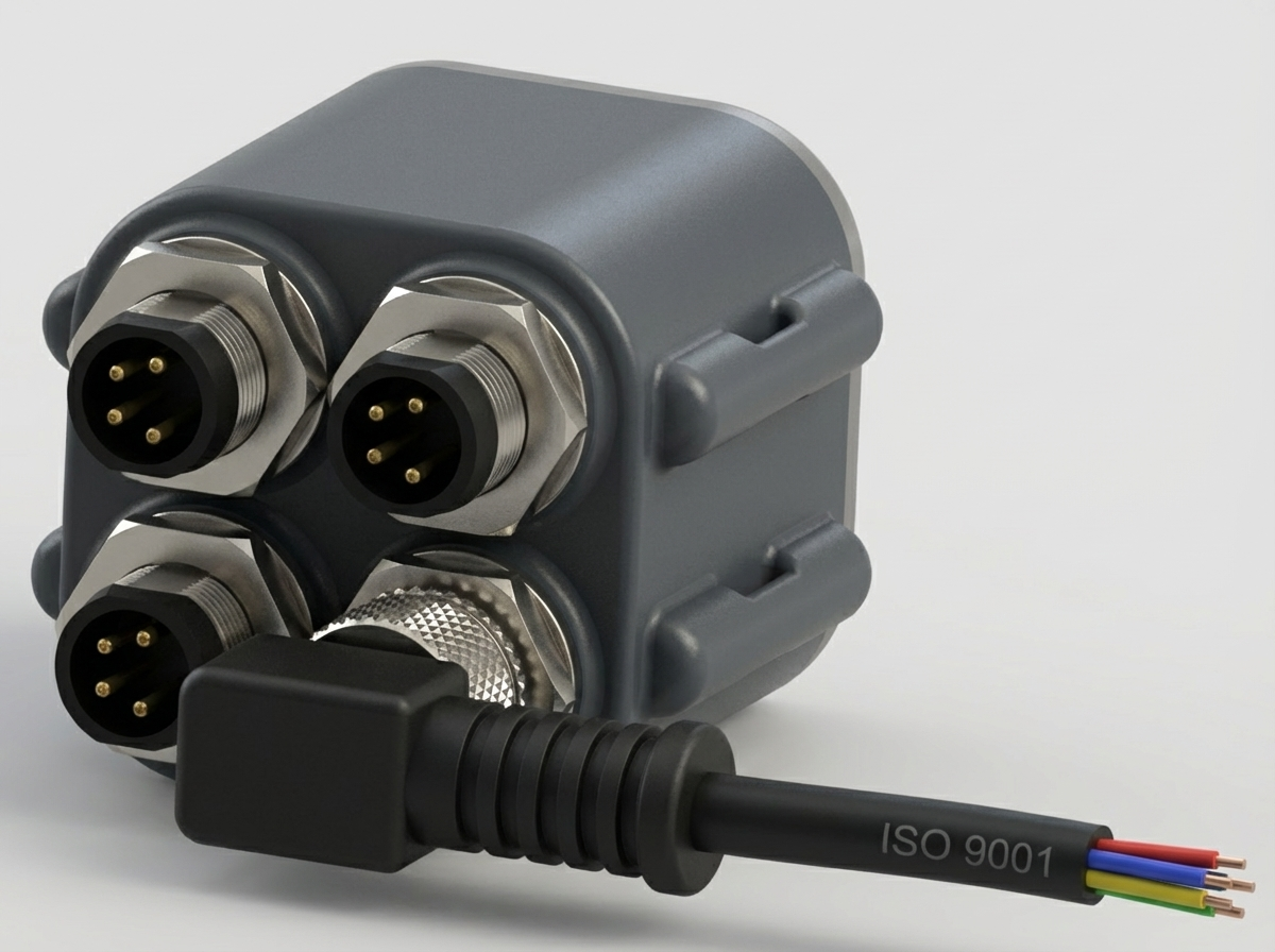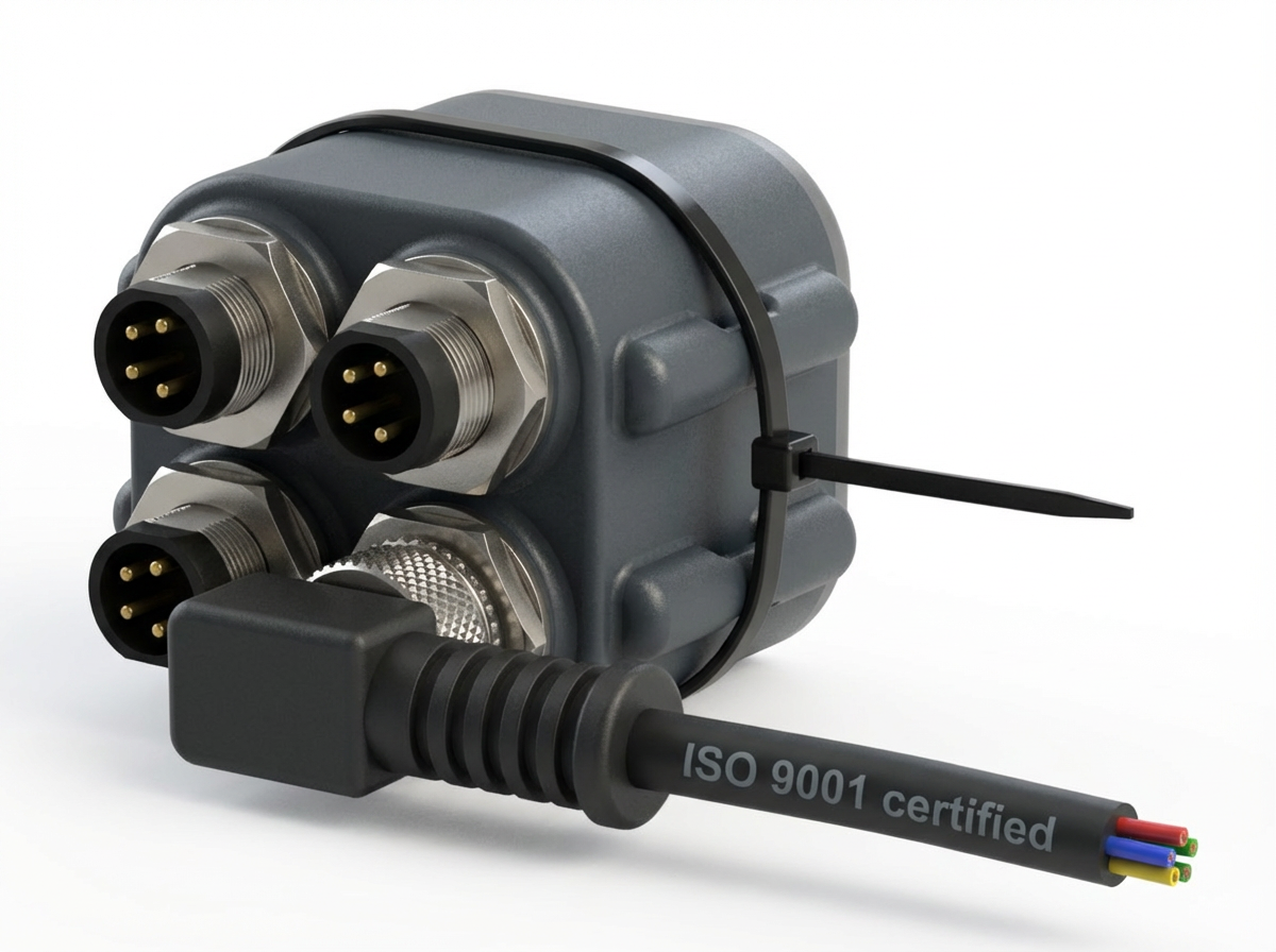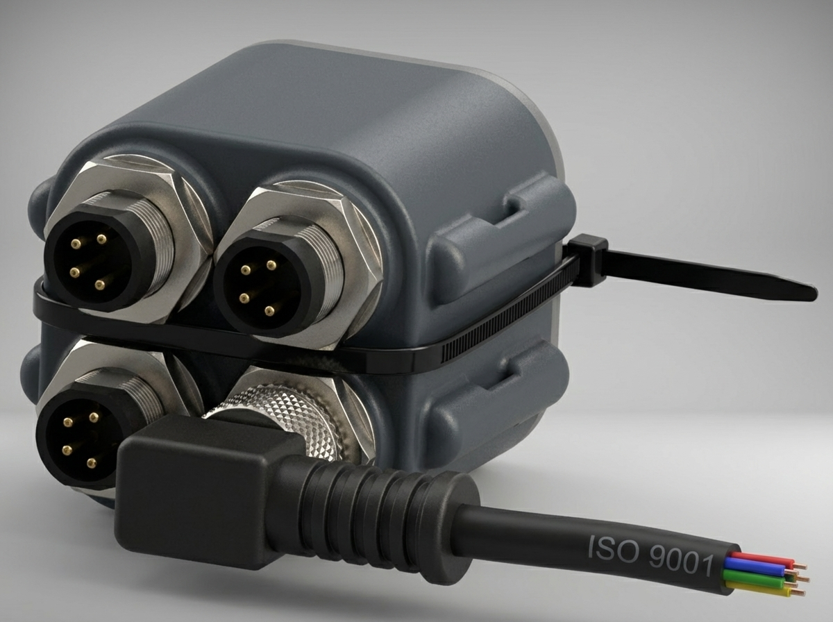Well, some characters left until we hit 500. Here we go: "Dark grey plastic for the housing and rear lid. The cylindrical extrusions under the nuts are part of the plastic housing. A black cable-tie is inserted through the holes and goes around the housing and is closed above it. Nickel plated metal parts, brass pins, rubber connector housing. Black PVC cable with horizontal print "ISO 9001" in light grey. Four wires are visible in the cut end face of the cable: One is red, one is blue, one is green and one is yellow. Rotate the part 20° to the left."