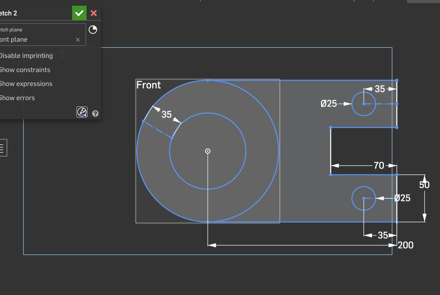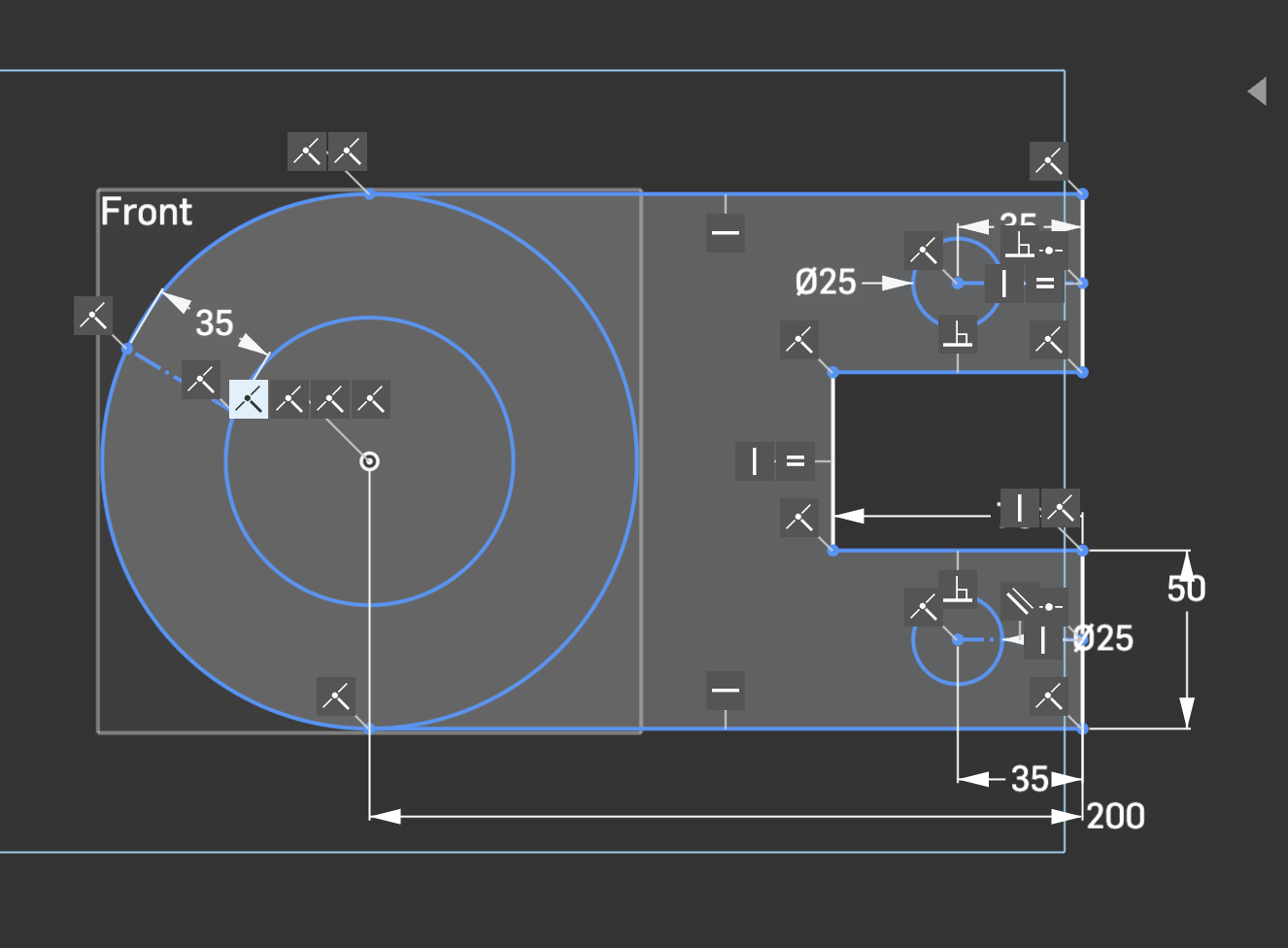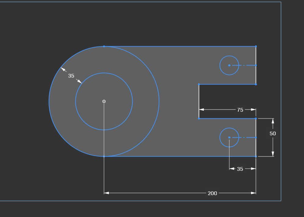The angled line with the 35 dimension is not aligned horizontally or at a specific angle. It's also not going through the center of the circles. in other words, there's not a lot really constraining the size of the whole thing.