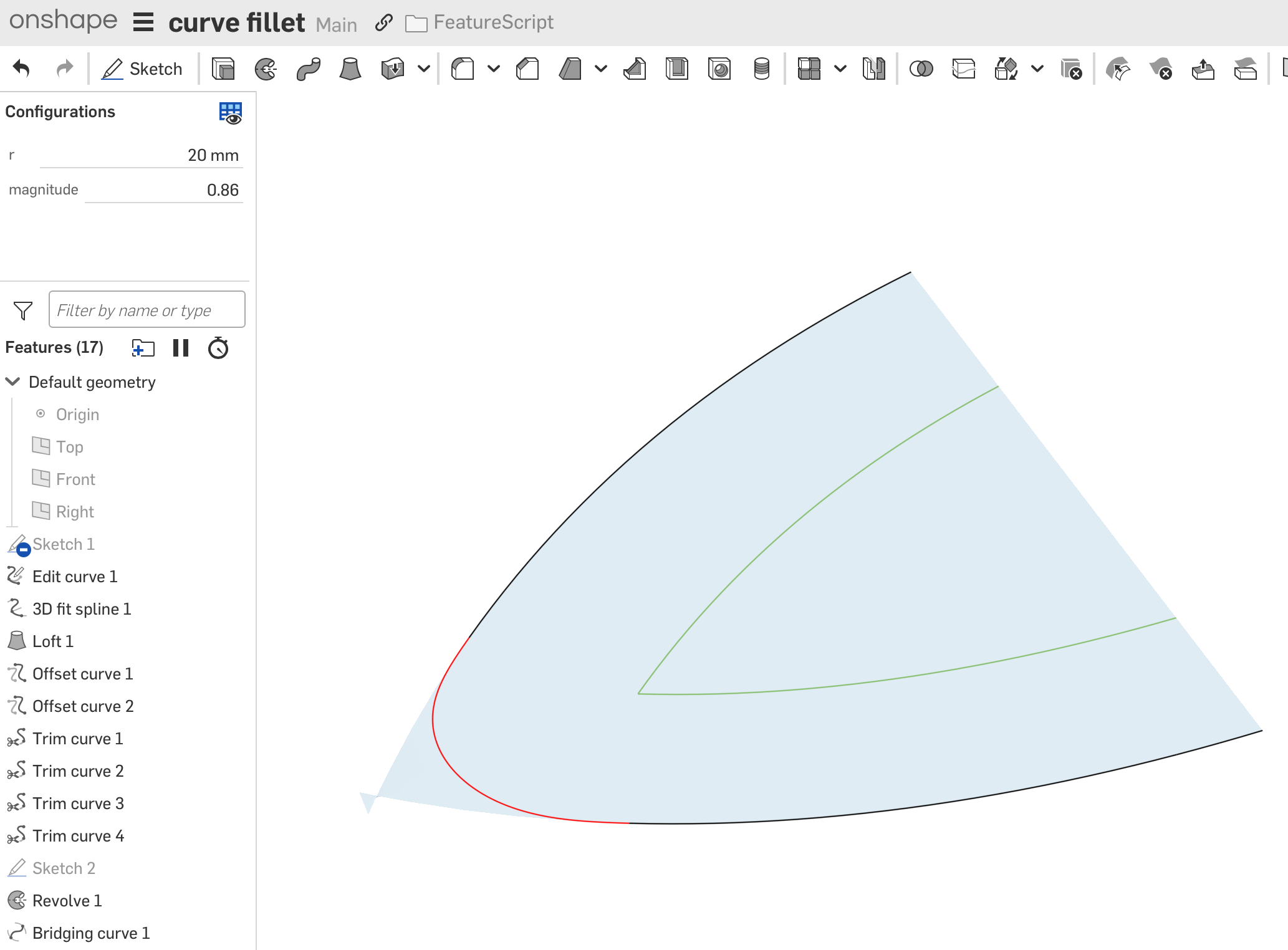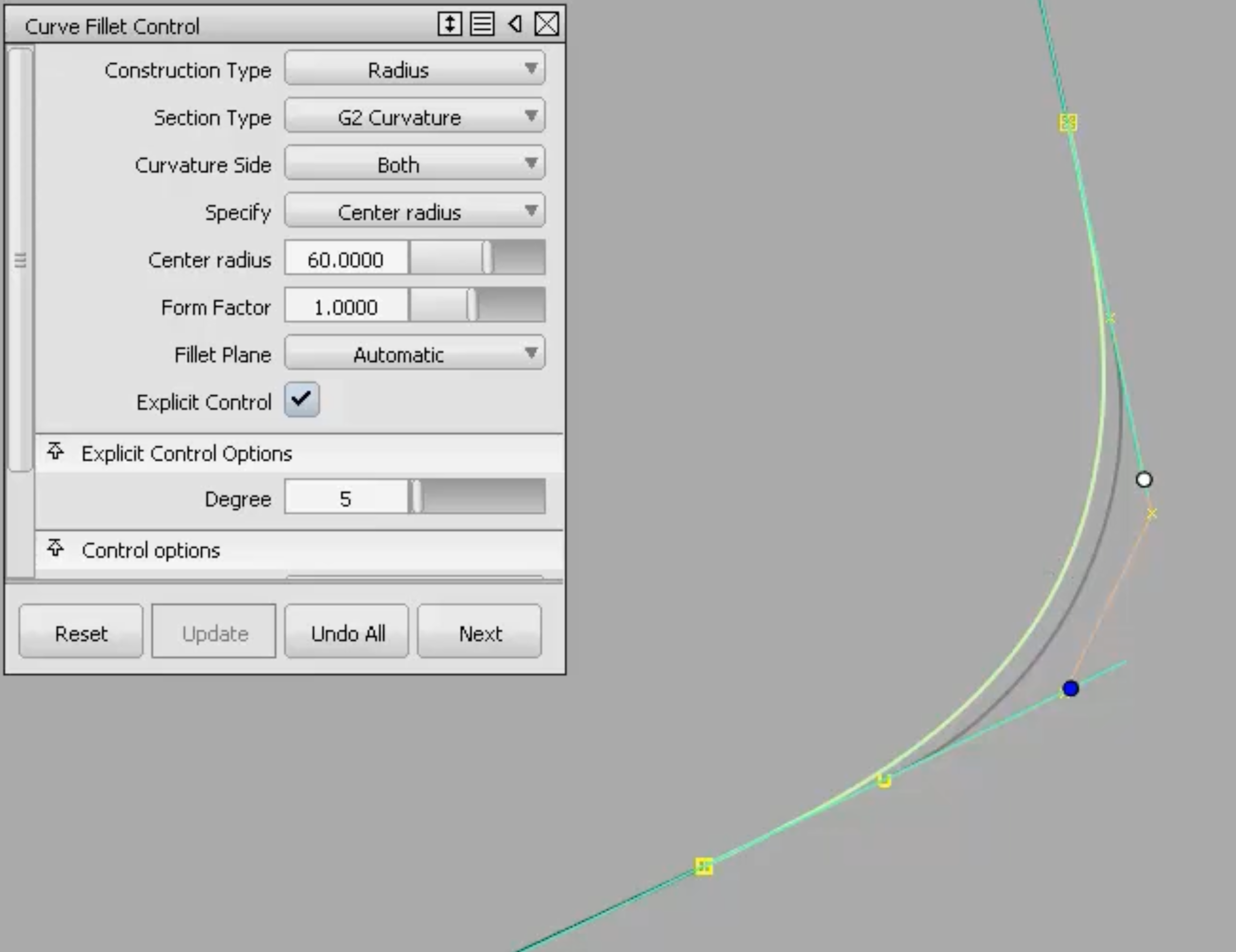The long term goal is to create something like Alias's Curve Fillet where the feature automatically trims the input curves, and has a few different ways to modify the shape symmetrically: