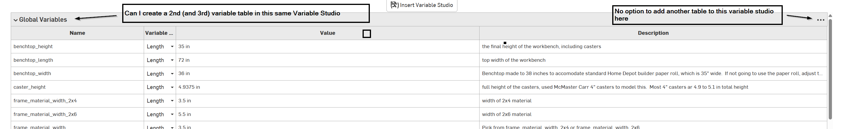 I am modeling a foldup workbench (https://cad.onshape.com/documents/e48dbff1ad91b2abd920c3b6/w/7ab6d2b84b3e6d6539693fb2/e/b639def723d2a7b70e7b5403) that has accumulated alot of variables in a single Variable Studio table I've named "Global Variables". Perhaps too many, but it's what I got.