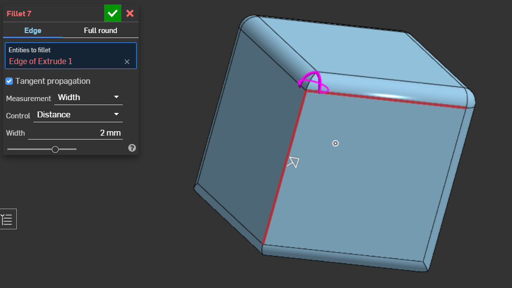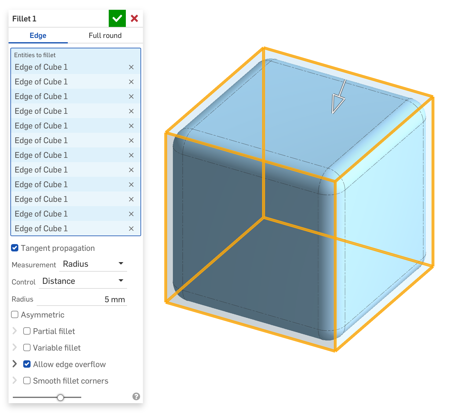 The top fillet in this part is set to Width and 5mm. The width is the chordal distance and drives the size. The radius value is a resultant.