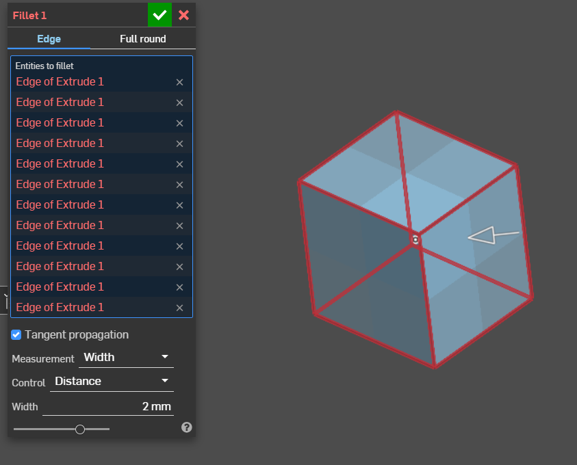 I am trying to make a dice, where I want to round (fillet) all the egdes. But I get this error: