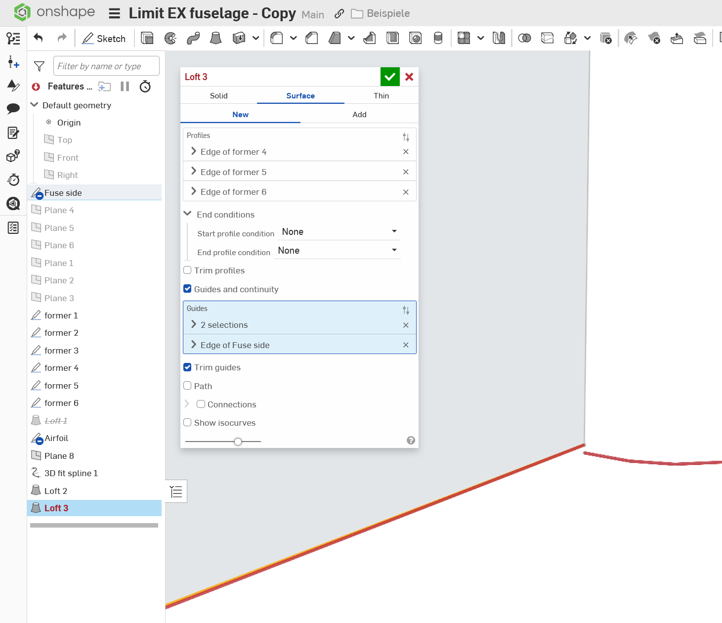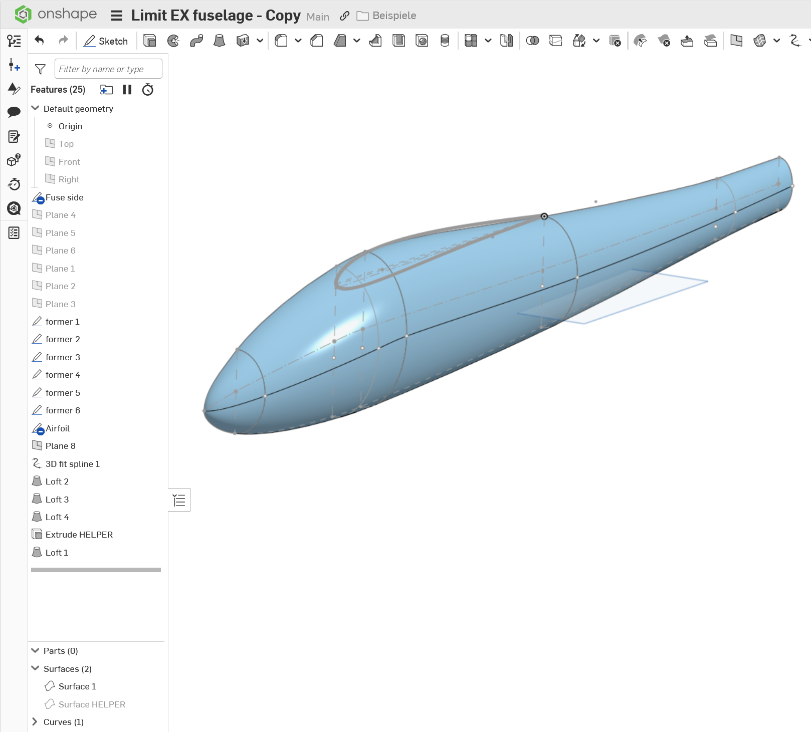 So this is where I am….a fuselage half I'm attempting to loft. I cannot get it to follow the splines defining the edges of the "Fuse side" sketch. I'm actually happy with it behind former 4, the way the top line ended up being curved. A happy coincidence. The issues are mainly ahead of former 3. The top surface between formers 3 and 4 will be removed when I cut the wing saddle, so even though it looks a bit odd it's probably fine.