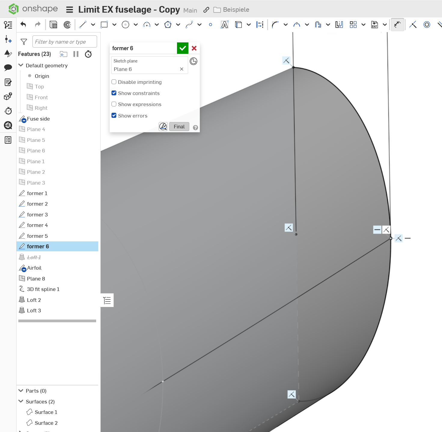 One more hint: If you model half of the fuselage (which I recommend to save on work and reduce the error rate), create some helper geometry to help with tangency after mirroring the other half. Look at what I did with the nose: There is an extruded surface that is only used to make sure the two halves meet smooth and with no bump at the mirror plane. Good luck!