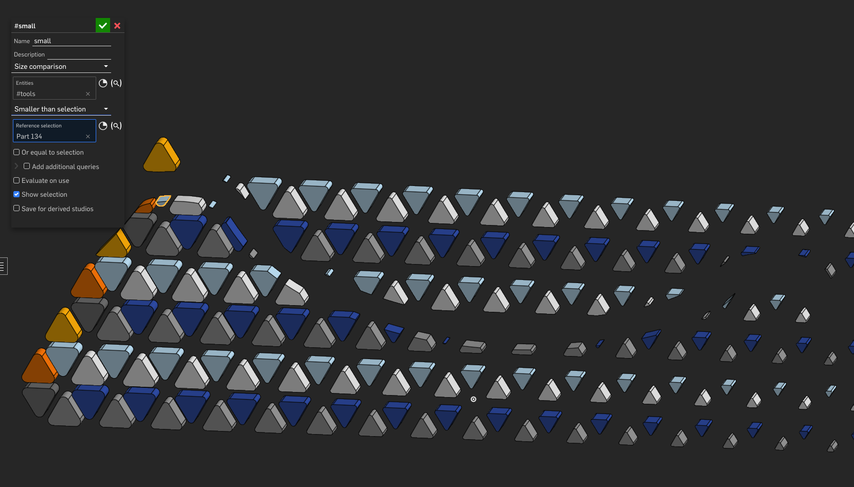 For example, the orange part I posted earlier, those internal crosses are identical on top and bottom and exist on the same plane, but I just wanted to select all the ones that were facing upward in order to chamfer. Had to split the part into two bodies, query the faces, then boolean, then chamfer.