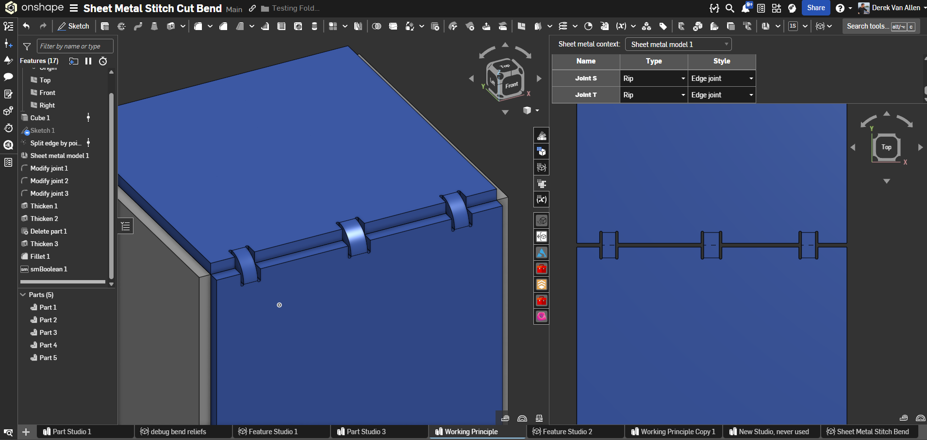 The working principle of the current iteration of this feature uses as much native sheet metal functionality as possible, both because I tried everything else first and ran into impenetrable bugs, and because performance in previous iterations was not worth publishing publicly. This version however, has pretty dang good performance for a custom sheet metal feature.
