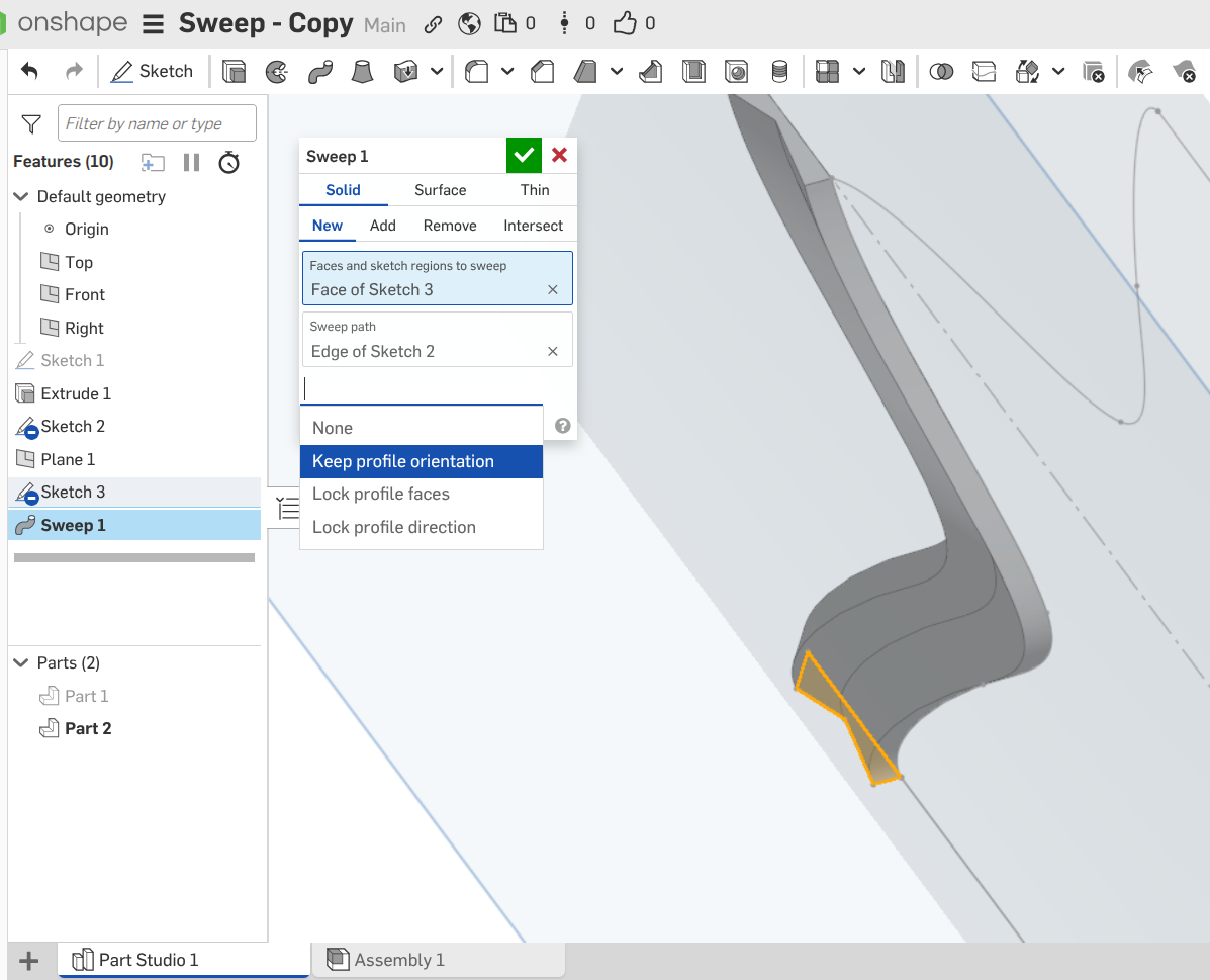 In Part Studio 2, I made another sweep that worked.