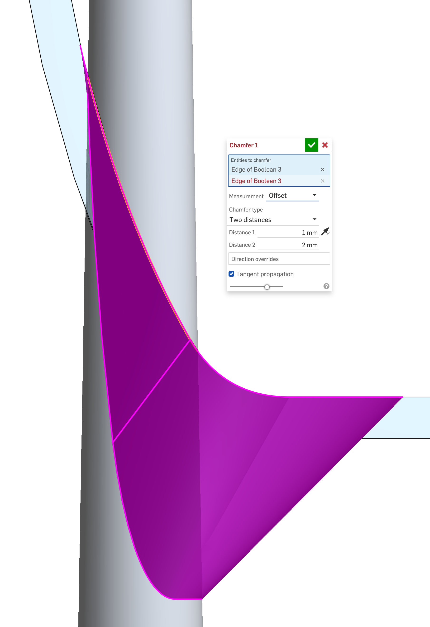 The two edges of the chamfer are somewhat ok on the lower side of the moat, but as it climbs the side wall, it's useless. If I switch to "offset" measurement I get this: