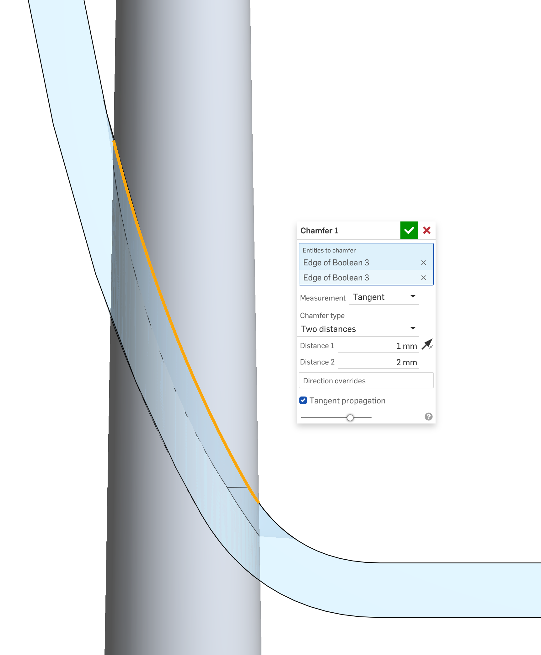 If chamfer was robust enough, that approach might work. Unfortunately I've run into too many things where it just says no. It also fails miserably to understand what D1 x D2 should do.