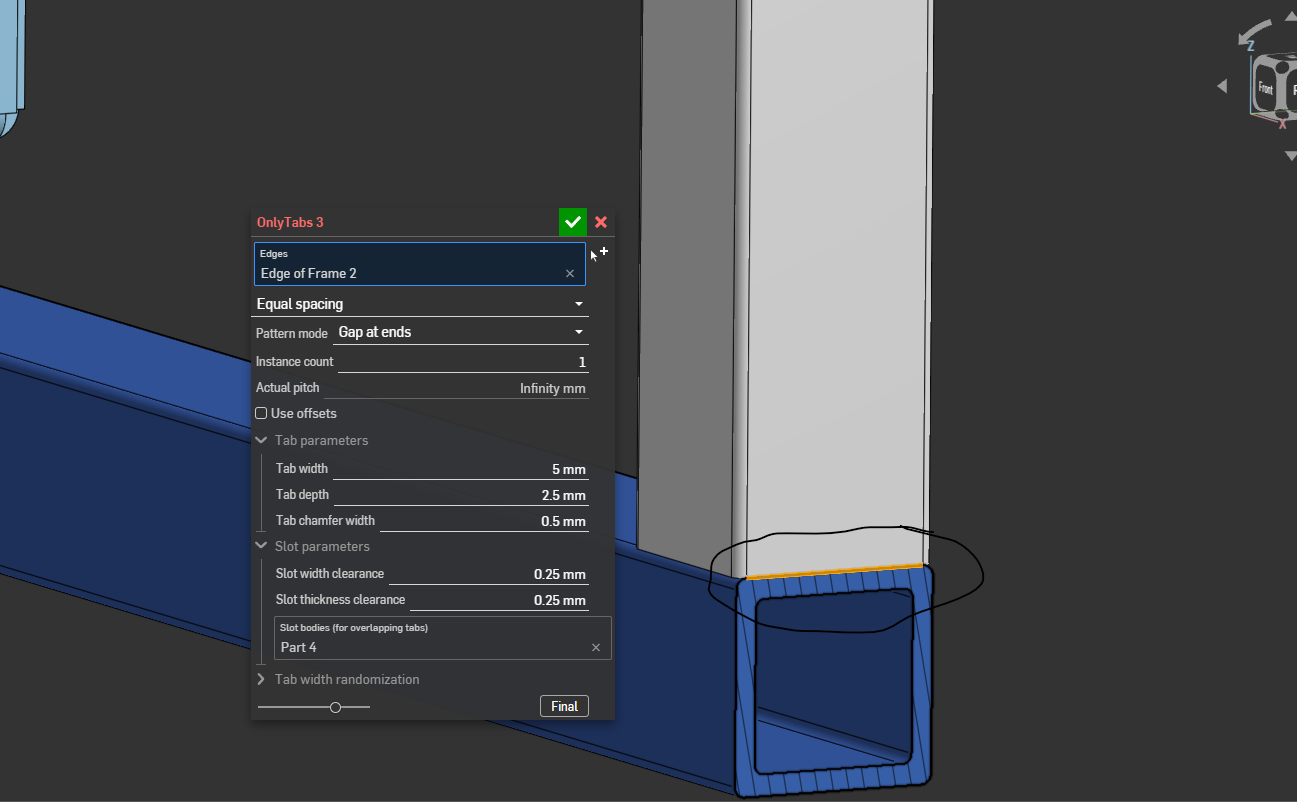 I have been trying to use OnlyTab to execute this feature on this 2mm thickness standard square tube but it seems to give me an error, not sure if I am doing something wrong, Thank you in advance.