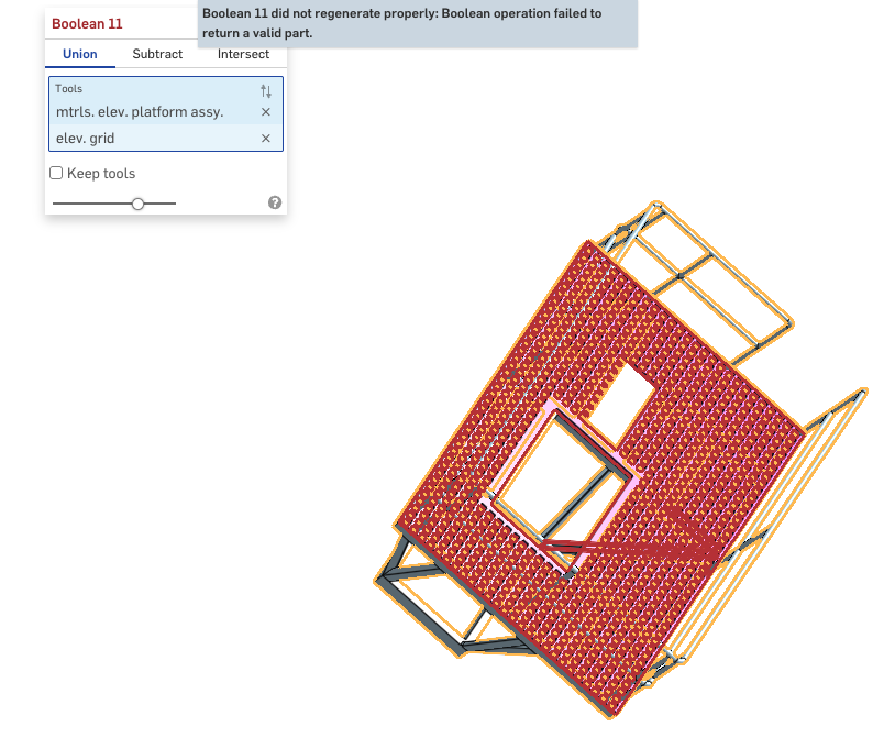 779 features is now the highest I've seen in one single part studio tab. That's impressive that the build time is "only" ~20 seconds for the amount of geometric torture happening in there. Usually you see this kind of failure when there's some kind of zero thickness geometry, self intersecting parts, or volumes meeting at only a single edge instead of some true overlapping or butting region. I wouldn't be surprised in this case if the boolean feature just took one look at the truckload of face intersections impending and did one of these though: