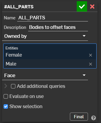 Is there a native tool that I am missing or a FS that will move/offset faces by part selection so that the tool updates if any upstream changes end up adding or removing faces?
